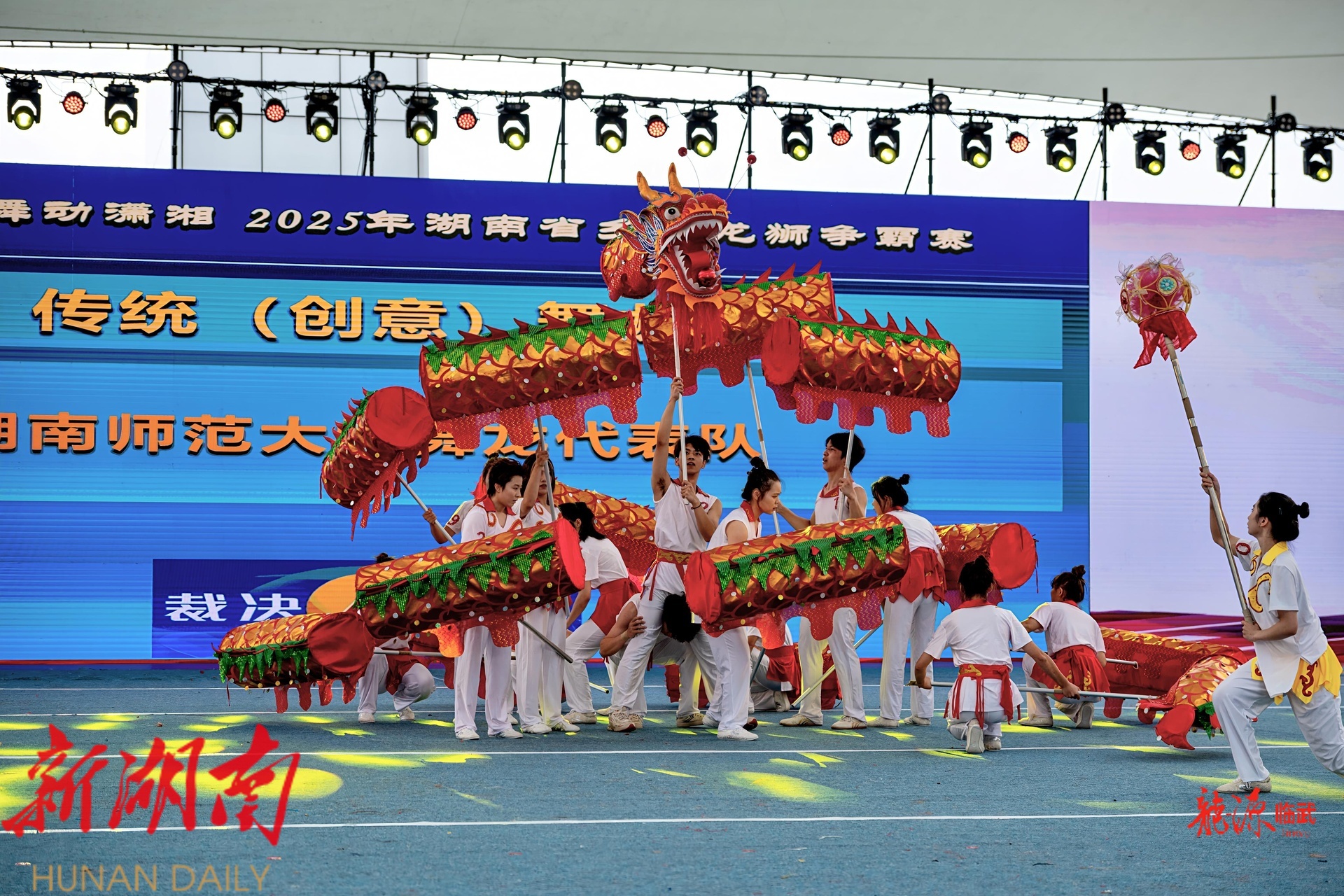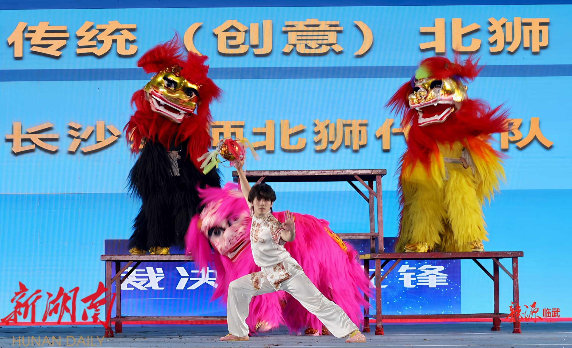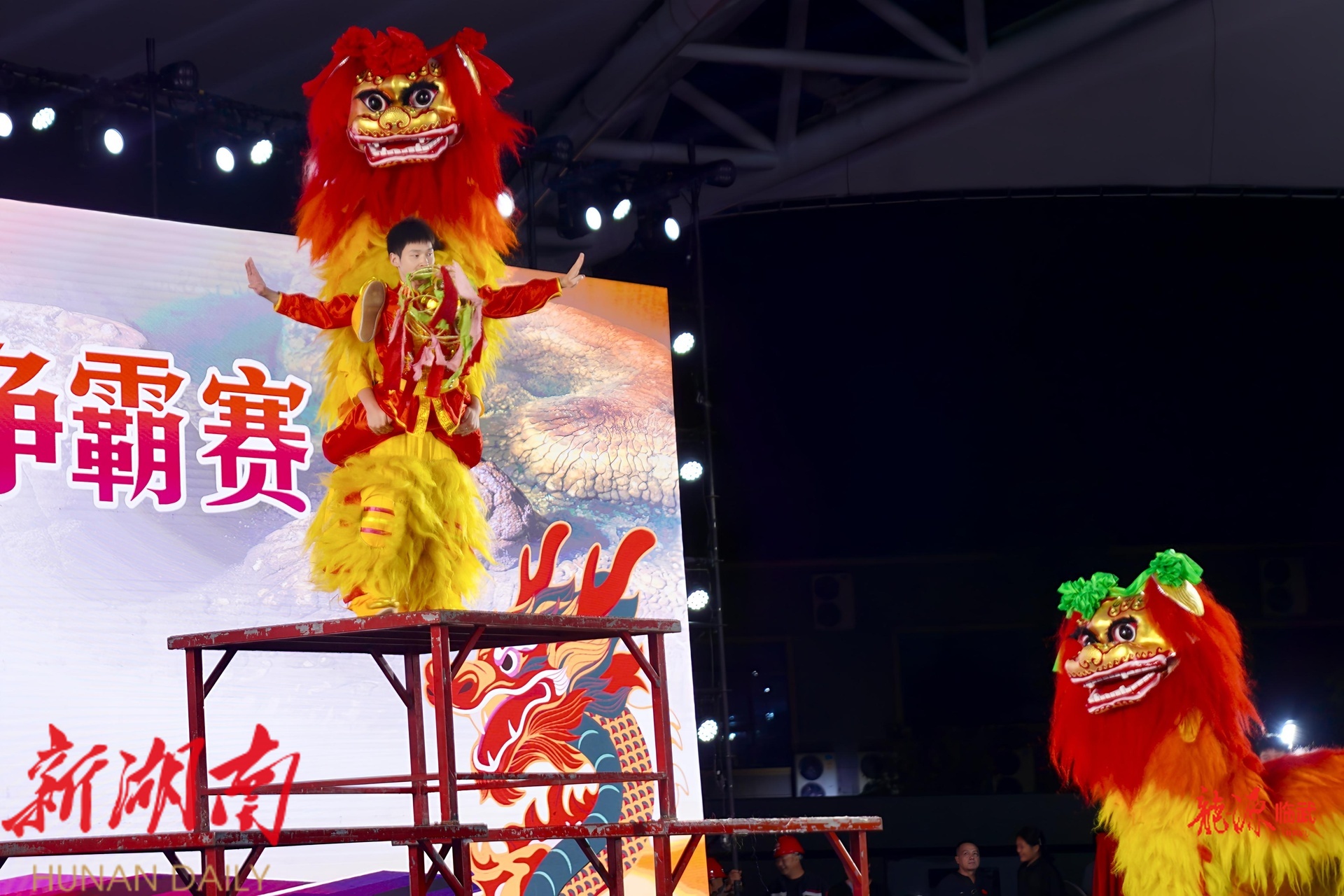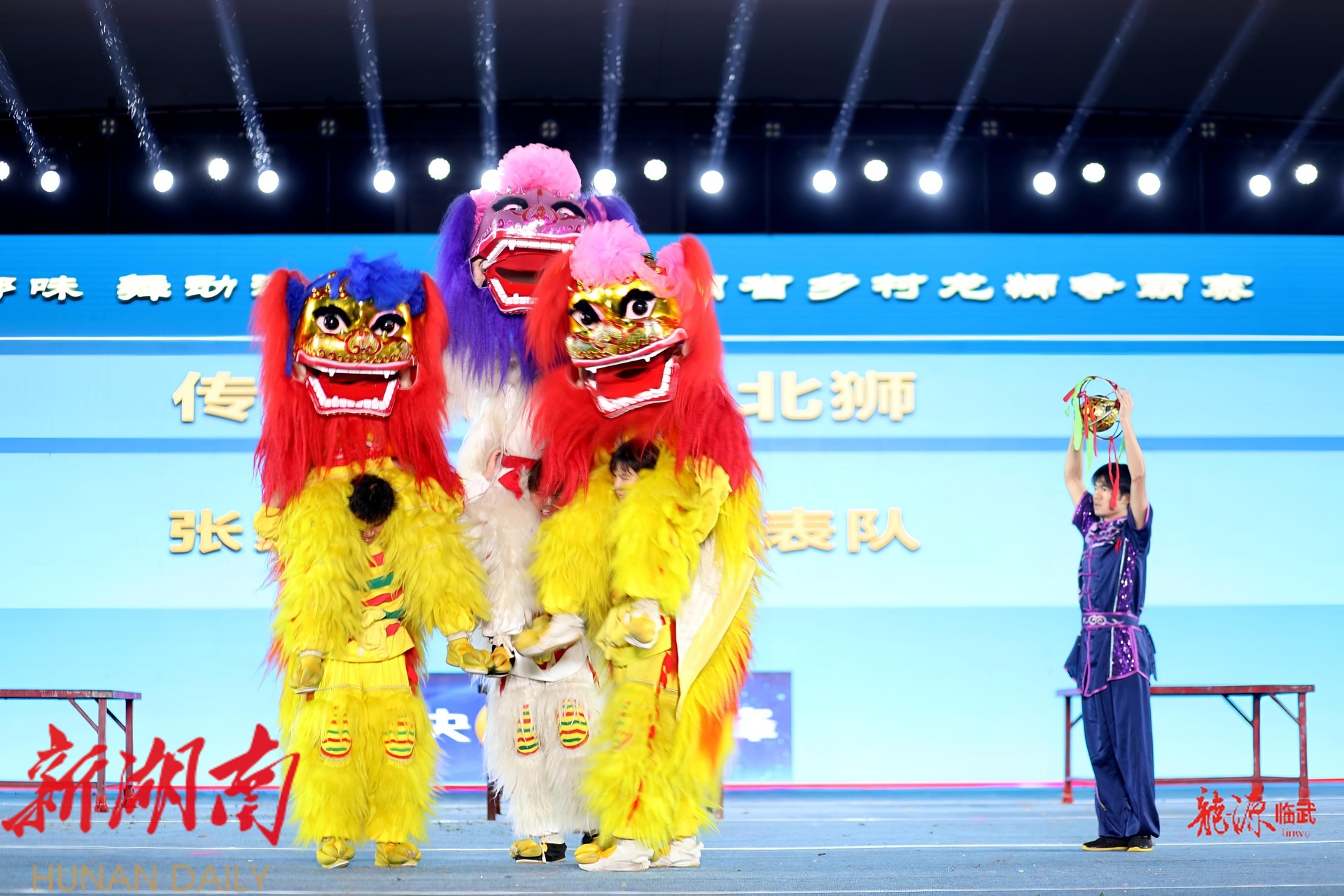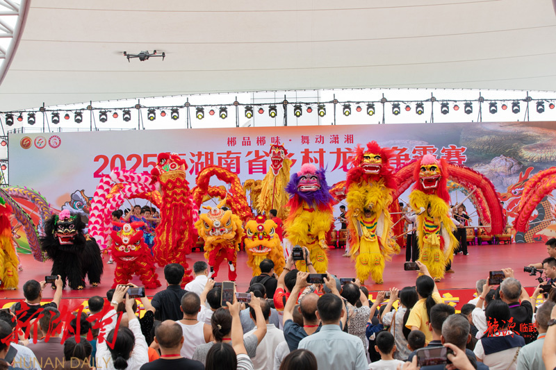 竞赛现场,涵盖了舞龙、南狮、北狮等竞赛项目,通过非遗龙狮巡游、传统竞技、创意展演等形式,全景式展现湘南龙狮文化的深厚底蕴与蓬勃创新,为广大市民呈现了一场“农文体商旅”深度融合,可观、可赏、可品、可游的民俗复兴“湘南片场”。