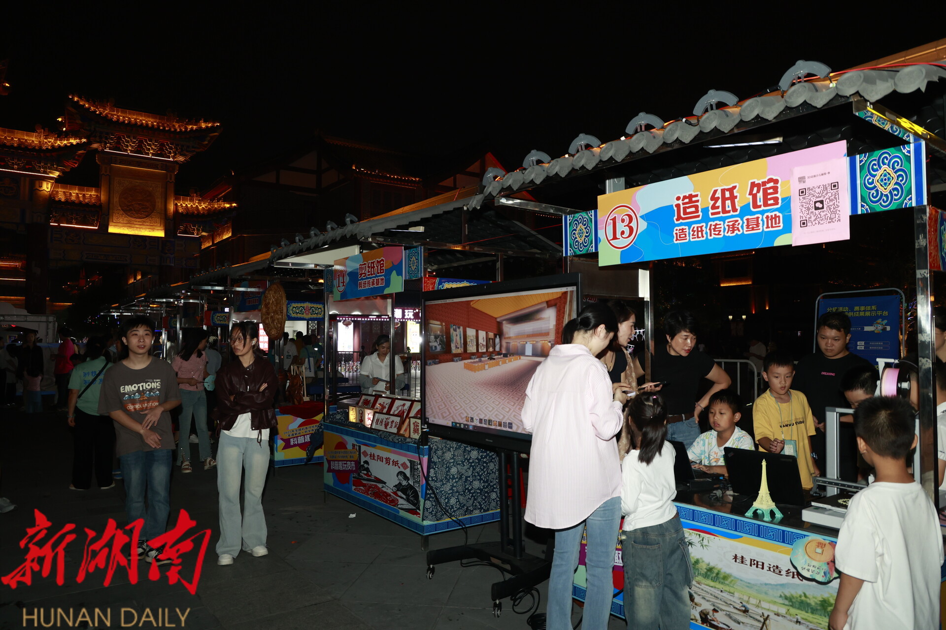 现场夜市还设置了非遗体验和科普摊位,陶艺、造纸、剪纸等体验区热闹非常,市民游客们零距离体验制作过程,解码制作细节中隐藏的科学奥秘。通过参与现场互动、科普游戏、集章兑奖,让大家留下科学探索与文化交融的奇妙印象。