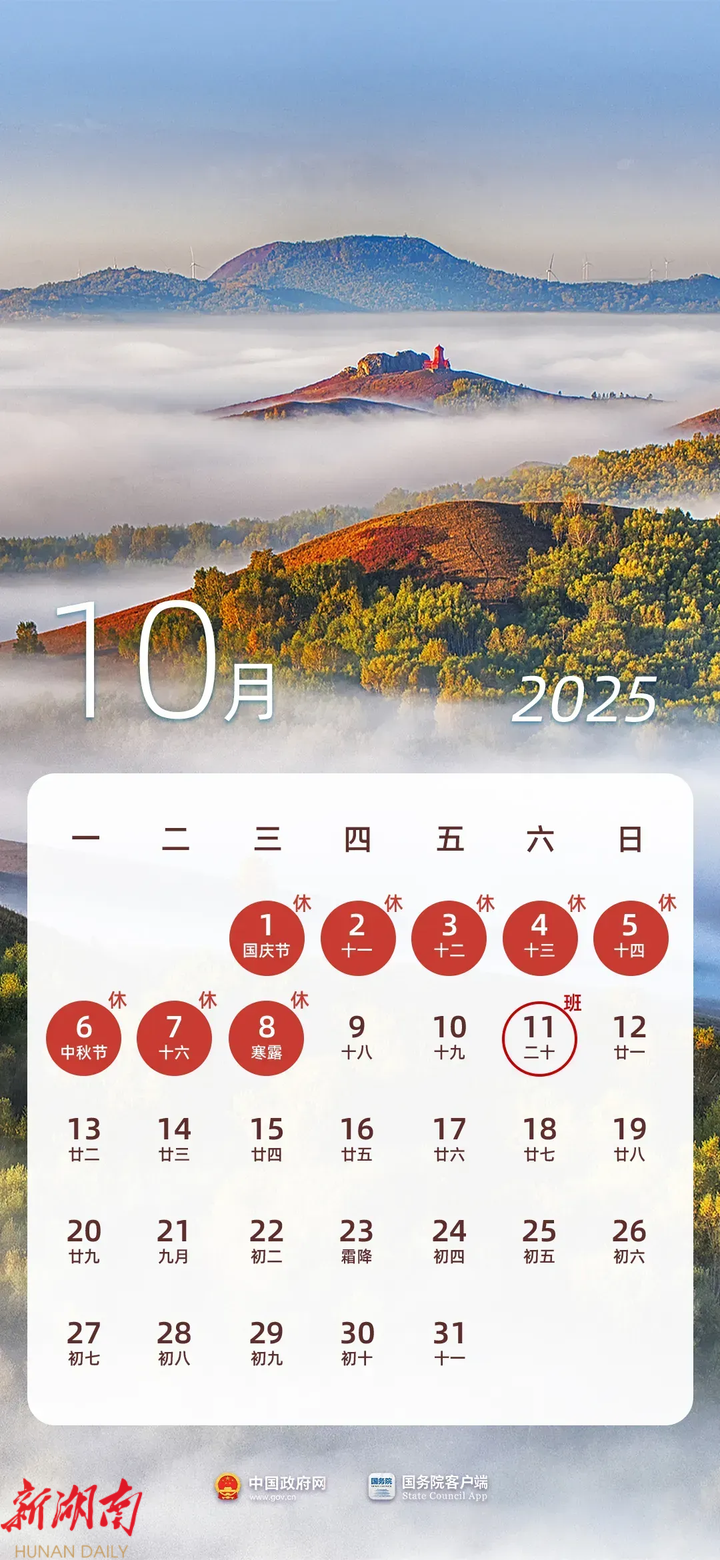 国庆中秋假期:10月1日至8日放假调休,共8天。9月28日(周日)、10月11日(周六)上班。所有收费公路(含机场高速、收费桥梁和隧道)免征小型客车通行费。10月9日0时起,恢复正常收费。