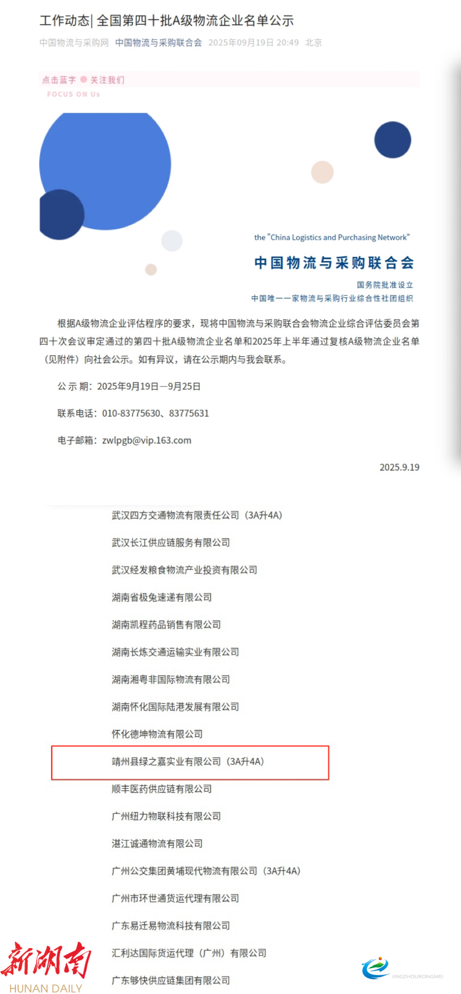 靖州融媒9月22日讯 (记者 孙文月)9月19日,中国物流与采购联合会物流企业综合评估委员会第四十次会议审定通过的第四十批A级物流企业名单公布,靖州苗族侗族自治县绿之嘉实业有限公司凭借突出的综合实力,成功上榜全国第四十批A级物流企业公示名单,标志着靖州物流企业发展水平获国家级认可。