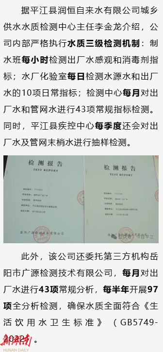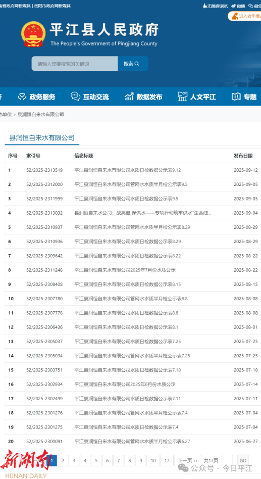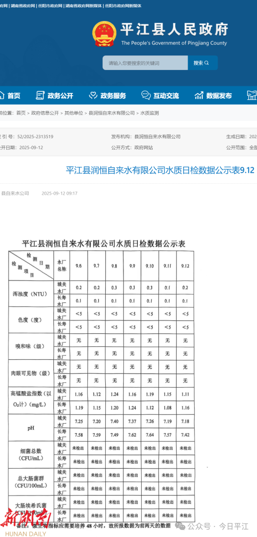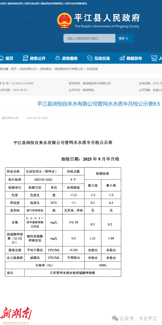 “检测不是‘内部事’,更要让市民看得见、能监督。”李金龙告诉我们,所有水质检测信息均通过湖南省供水水质在线监测系统、平江县政府门户网等平台定期公开, 涵盖水源水、出厂水、管网水的半年检、月检、半月检及日检数据 ,真正实现从“源头”到“龙头”的全过程透明化保障,守护市民用水安全。