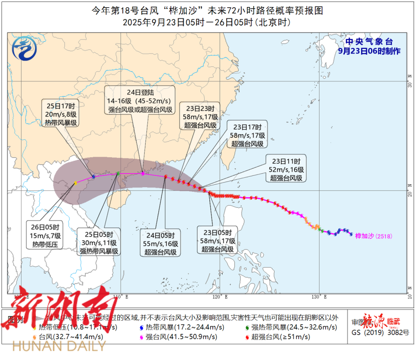 今年第18号台风“桦加沙”(超强台风级)的中心今天(23日)上午10点钟位于广东省阳江市东偏南方向约640公里的南海北部海面上,就是北纬20.1度、东经117.9度,中心附近最大风力有17级(58米/秒),中心最低气压为920百帕,七级风圈半径340-380公里,十级风圈半径160-180公里,十二级风圈半径80-90公里。