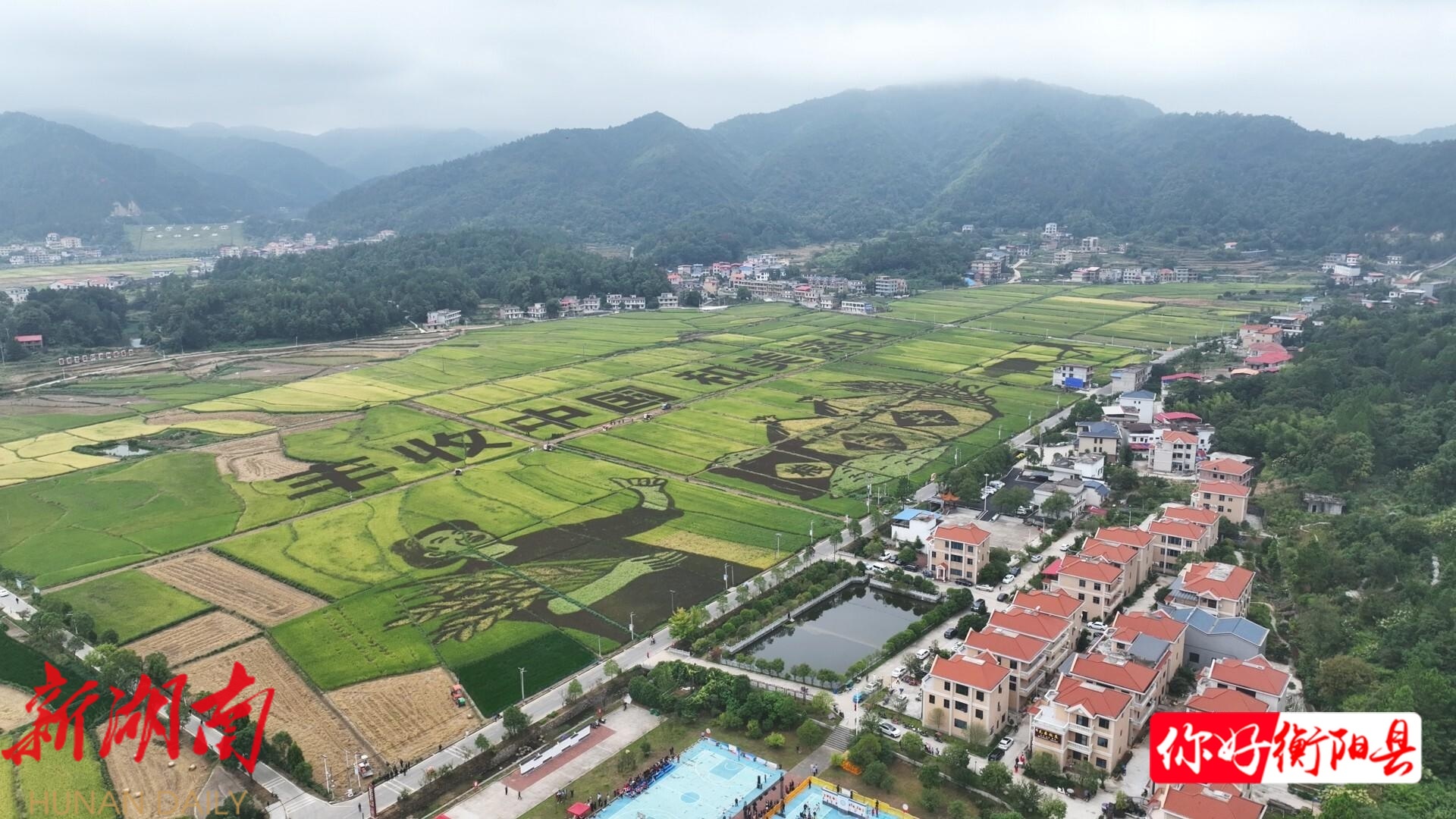 在库宗桥镇金华山下,广袤的田野稻浪翻滚、稻香扑鼻,从高空俯瞰,由黄、绿、紫、红等多色水稻组成的稻田画错落其间,给中国农民丰收节增添了几分欢愉。