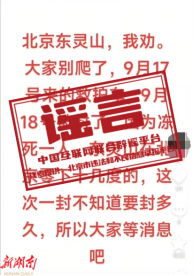 真相: 近日,一则东灵山被“封山”的消息在网上流传,有网友称“封山”的原因是“有人夜爬时被冻死”,还有网友称是“有人在山上被蛇咬”。经北京市门头沟区清水镇政府、区文旅局等有关部门核实,上述信息均为谣言。