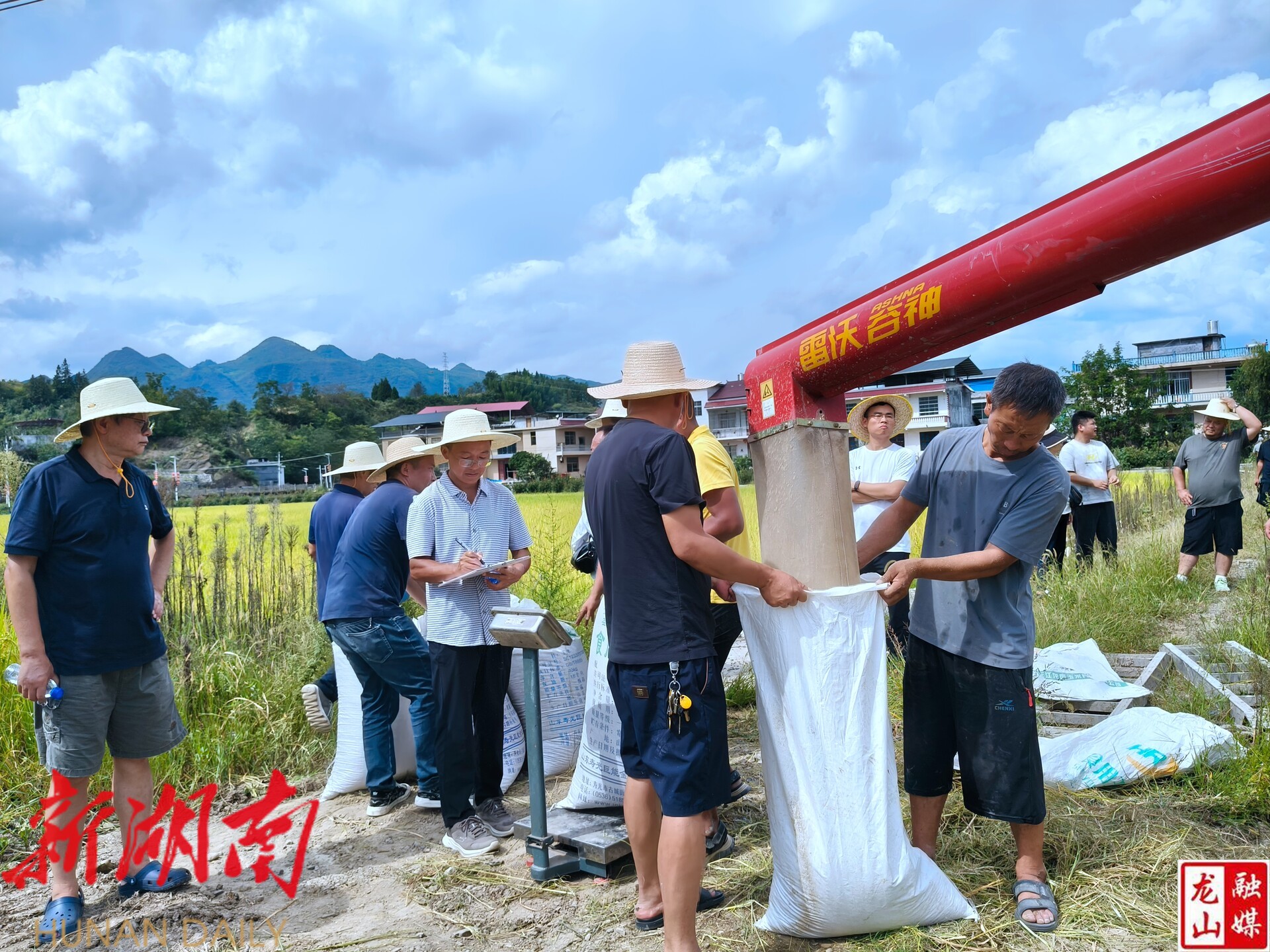 在龙山县召市镇红卫村“三一工程”综合示范基地,微风拂过,金浪滚滚,种植户们脸上洋溢着丰收的喜悦。三台收割机机手早已提前做好各项准备,他们动作娴熟,一行行稻谷被收割、脱粒、粉碎稻秆……不到20分钟,一大片稻谷完成收割,随后进行称重去水测试亩产。