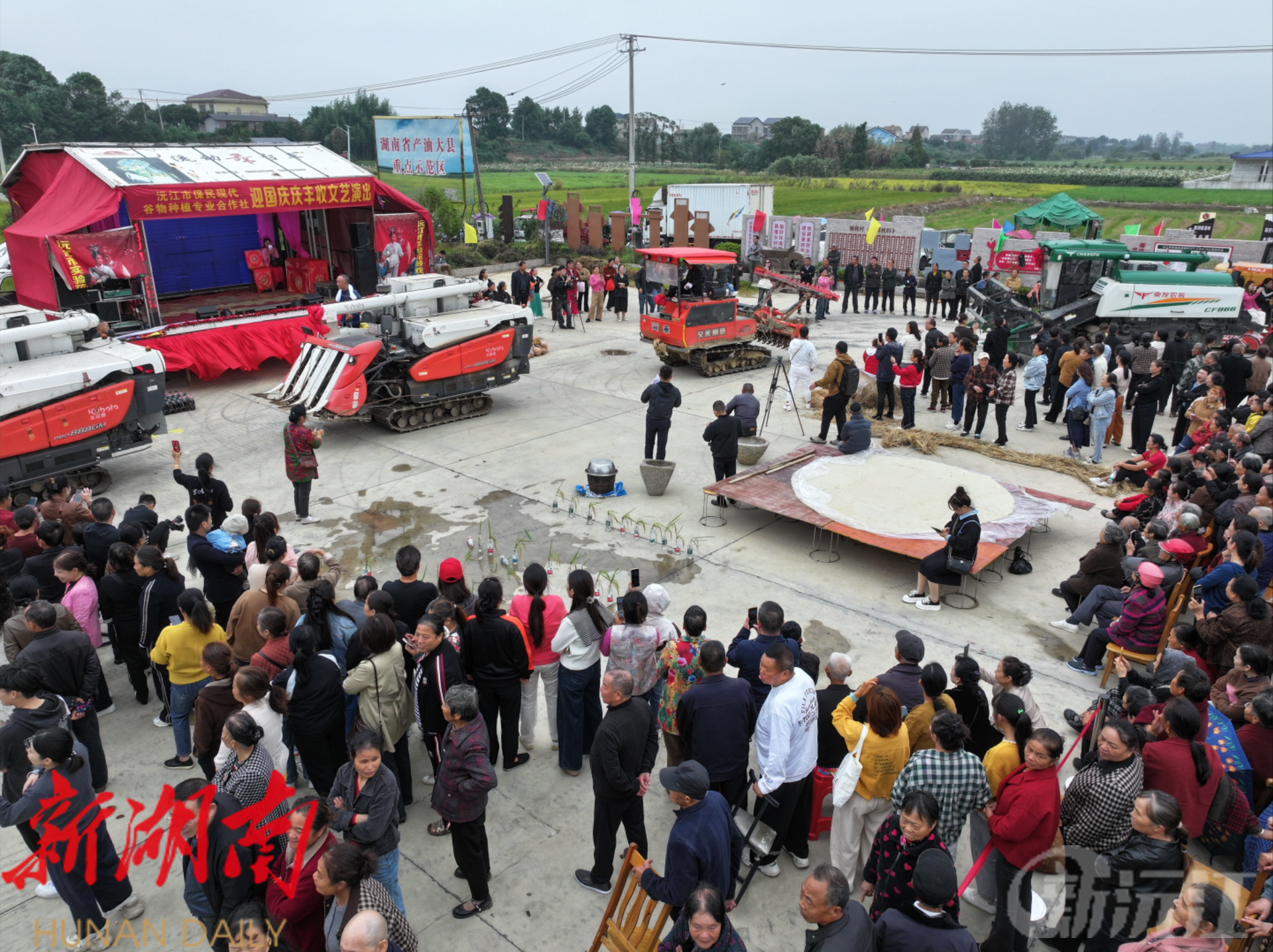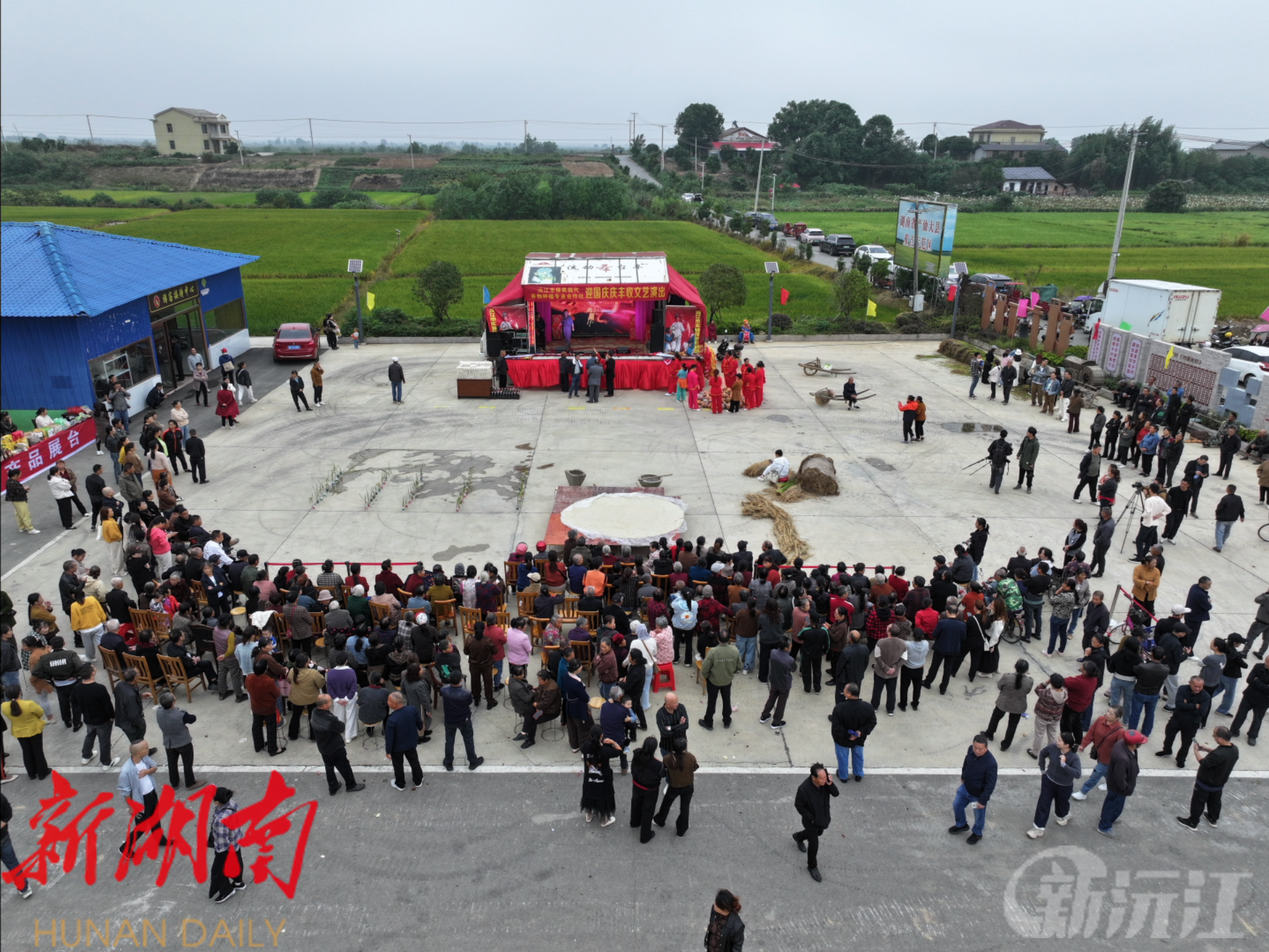在沅江市保民村现代农机专业合作社,人潮涌动,游人如织。人们耍起龙灯花鼓,跳起欢快的广场舞,共同庆祝他们的丰收节。