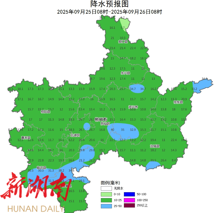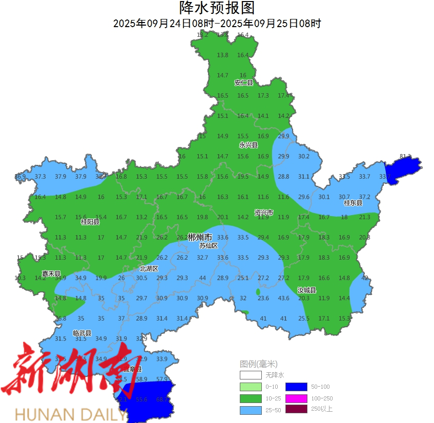▲24 日 08 时至 26 日 08 时郴州市降雨量预报图