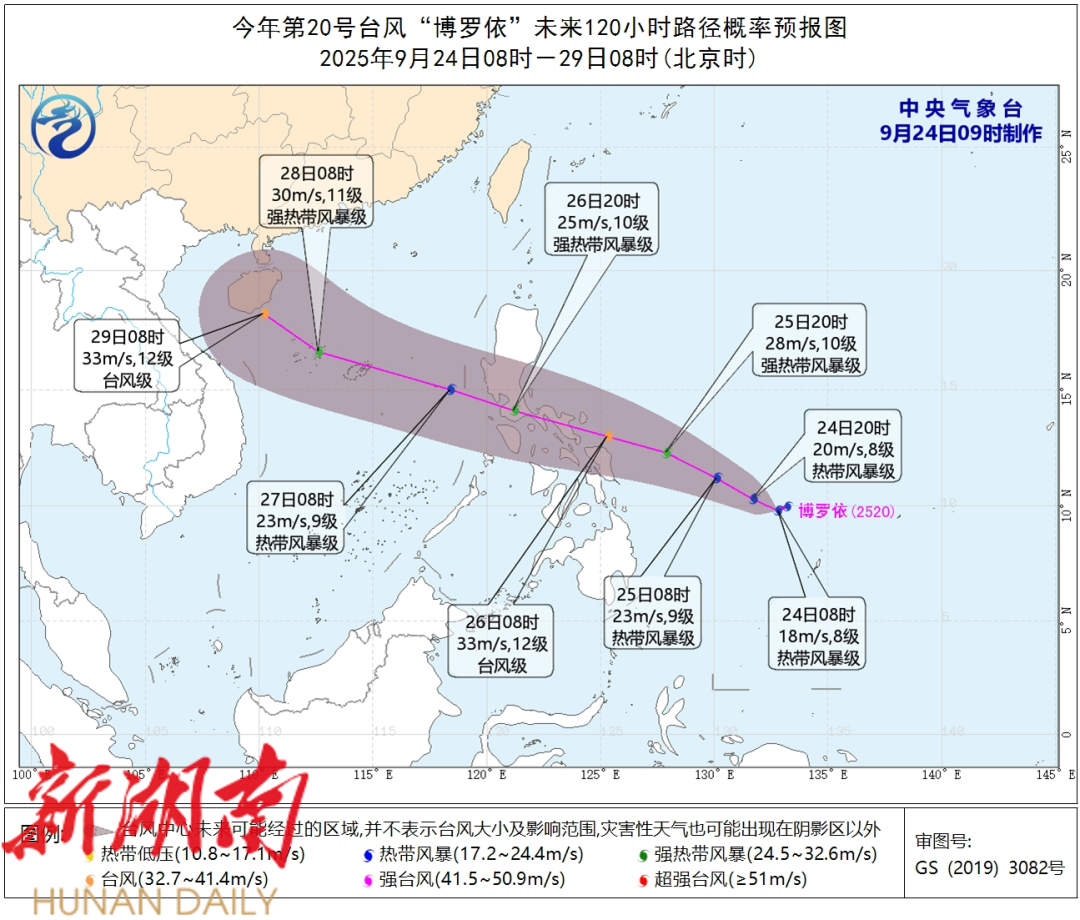 今年第 20 号台风“博罗依 ”(热带风暴级)于 24 日早晨 8 点钟在菲 律宾以东洋面生成,预计,“博罗依”将以每小时 10-15 公里的速度向偏西方向移动,逐渐向菲律宾东部沿海靠近,于 27 日进入南海东部海域,之后向西北方向移动, 强度有所增强。