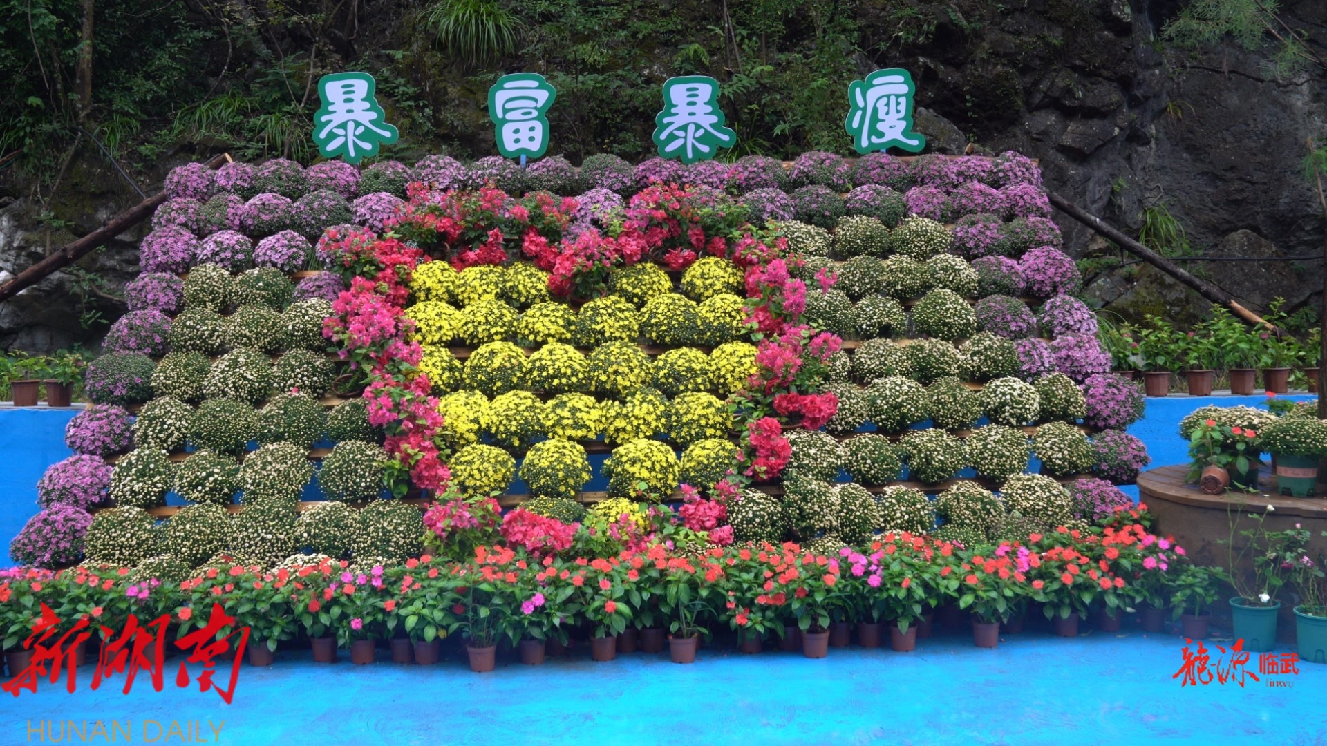 在滴水源景区,工人们正在架设花架,有序摆放千头菊,通过以黄色菊花为基底,搭配红色凤仙、缤纷三角梅等花卉,在瀑布旁精心营造层次丰富、色彩协调的花艺造型。