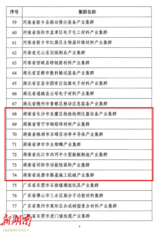 本次公示新增的7个产业集群为长沙市岳麓区检验检测仪器设备、常宁市铜铅锌材料、株洲市石峰区功率半导体、津市市生物酶、沅江市内河中小型船艇制造、祁阳市功能性面料和涟源市路基施工机械。