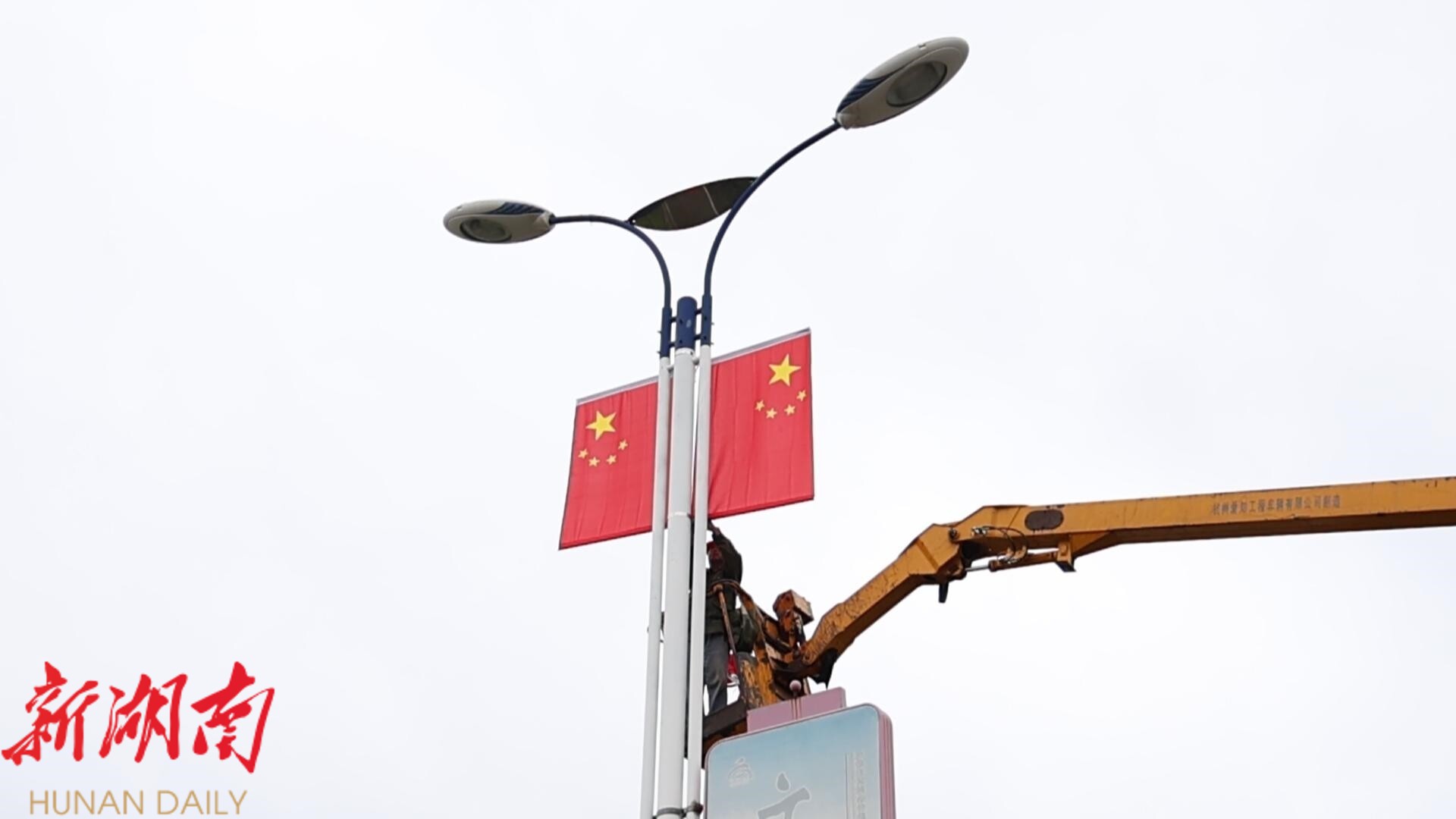 记者在施工现场看到,市政工人正在高空作业车上忙着悬挂国旗。在每一盏路灯的两侧,悬挂的国旗整齐对称,在秋风中猎猎作响,鲜艳的红色与周围的绿树及城市建筑交相辉映,形成一道亮丽的风景线。