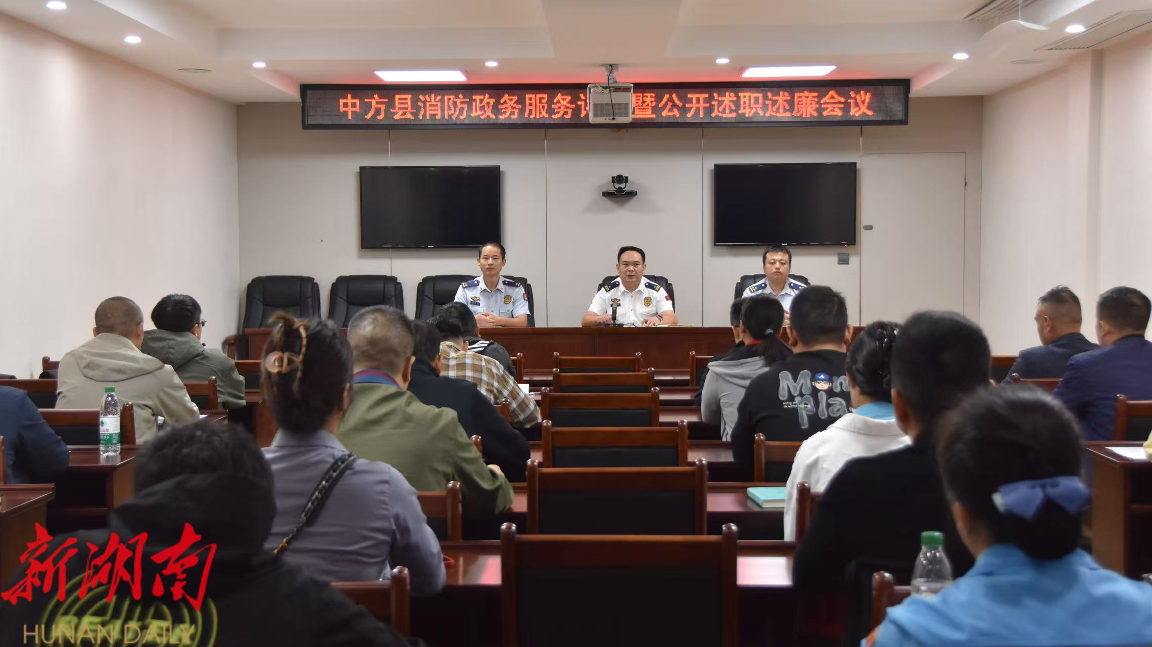 中方融媒9月27日讯 (通讯员:张玲慈)为主动接受社会监督、加强队伍作风建设,9月26日,中方县消防救援大队组织召开政务服务评测暨公开述职述廉会议,大队全体执法人员及辖区重点单位负责人参加。