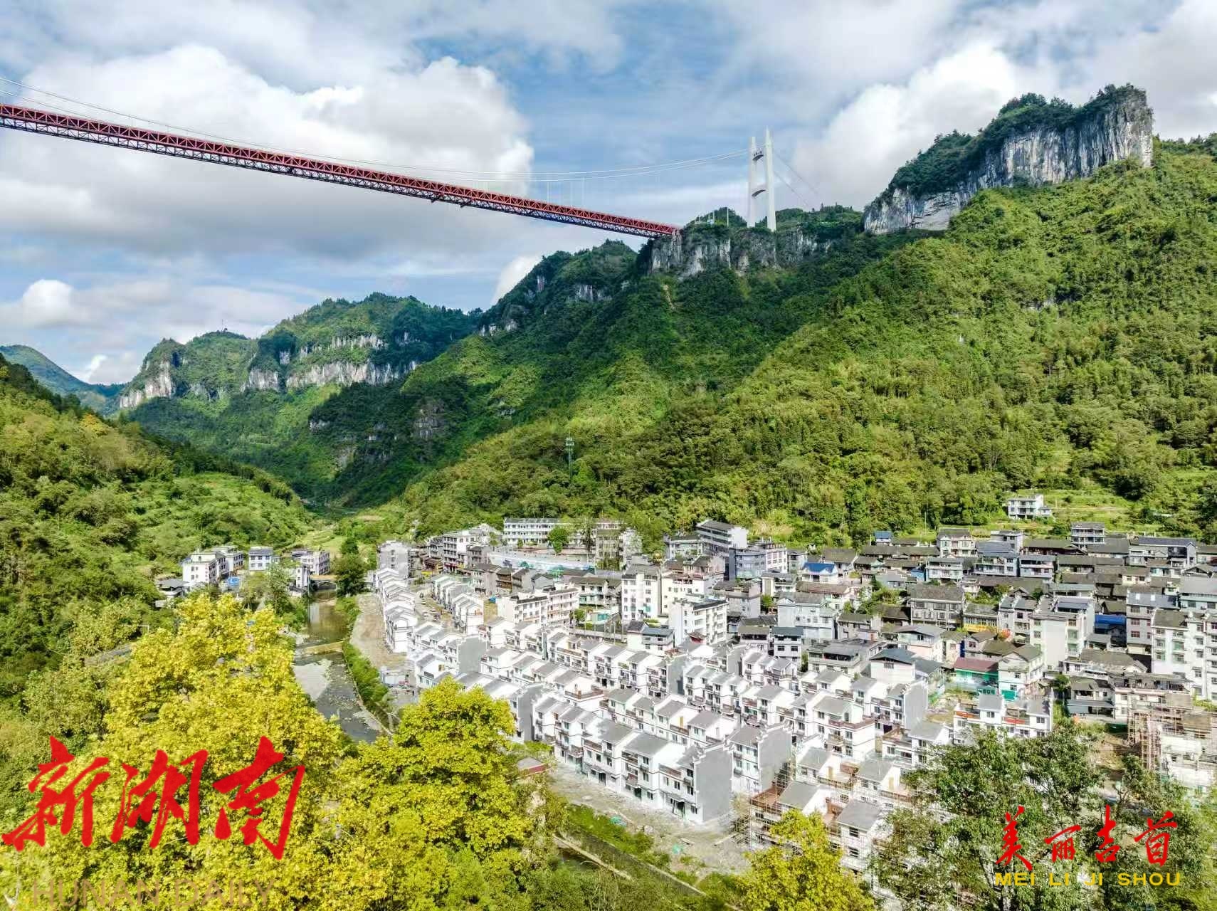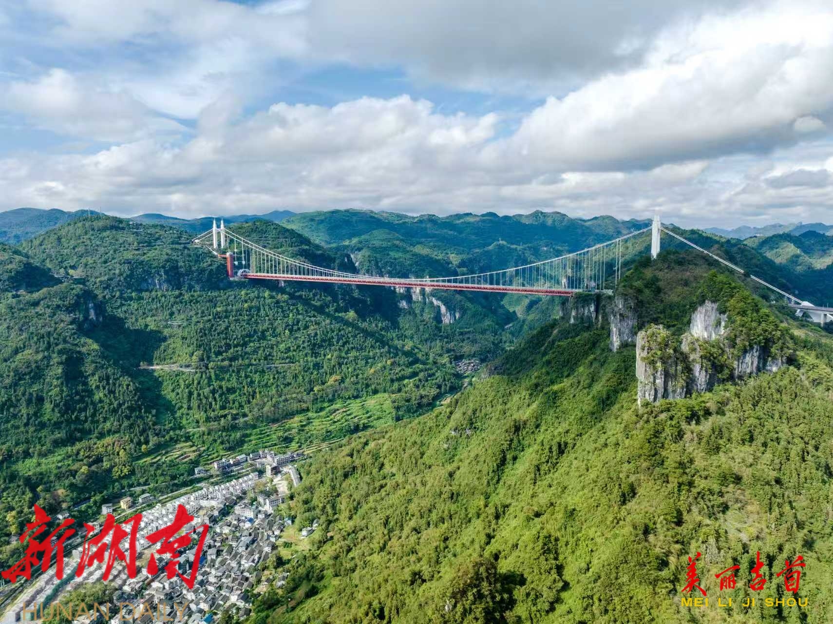 吉首市融媒体中心9月27日讯(全媒体记者 彭璟) 9月27日,吉首市矮寨镇,雄壮的矮寨大桥横跨峡谷,与山间错落的民居在蓝天白云的映衬下相映成趣,构成了一幅风光如画的秋景图。