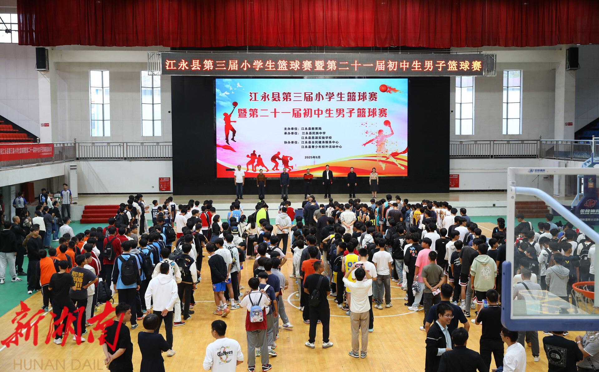 江永融媒9月28日讯(记者 陈丽华 通讯员 黄云香 罗水辉) 篮球跃动展风采,少年逐梦绽芳华。9月26日,江永县第三届小学生篮球赛暨第二十一届初中生男子篮球赛开幕式在江永一中体育馆隆重举行。来自全县各中小学校的29支代表队、350名运动员齐聚一堂,共同开启青春体育盛宴。