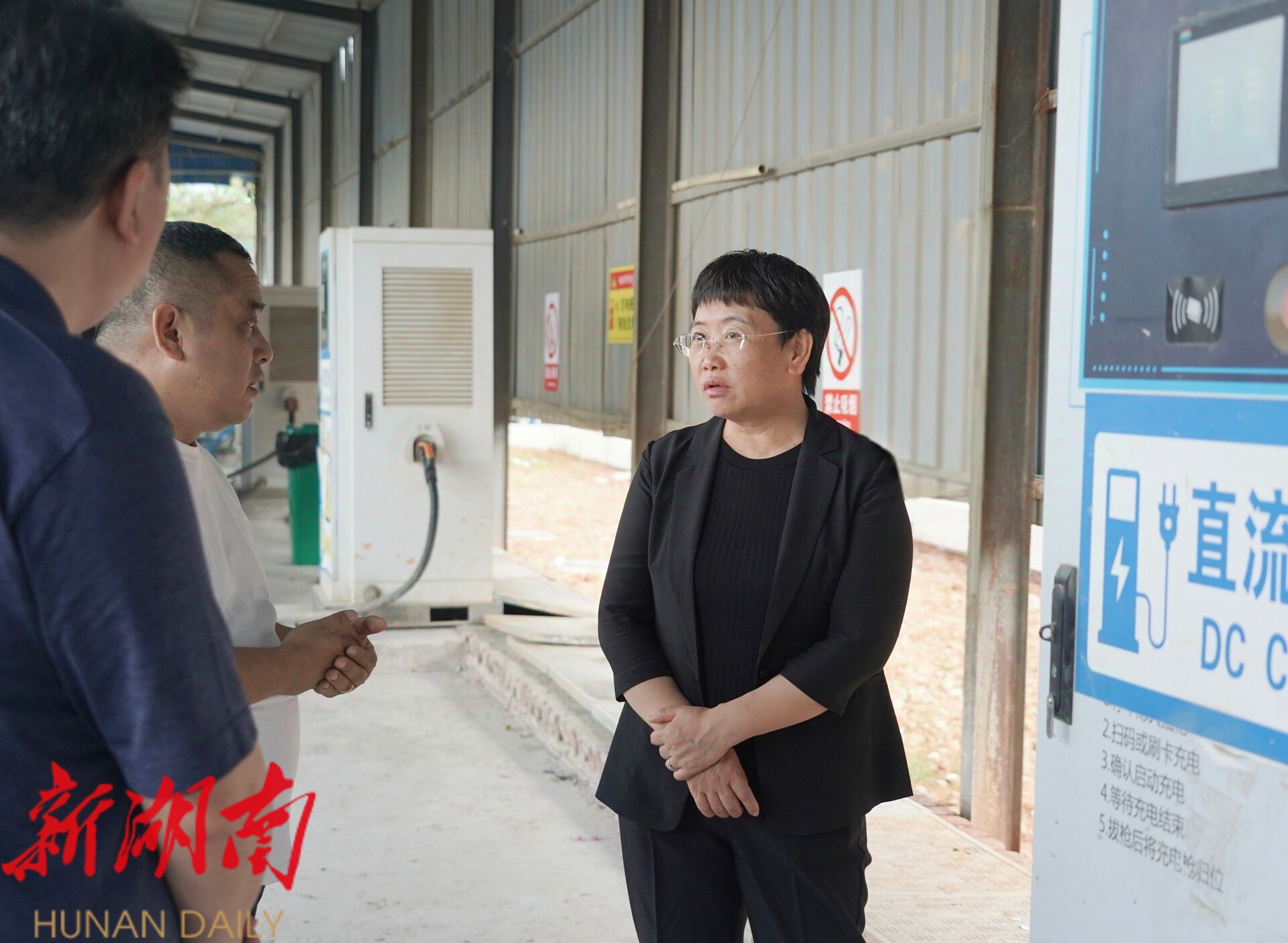 黄忆钢在靖州城乡公交客运有限责任公司详细了解公交车充电蓄能情况(蒲湘萍 摄)