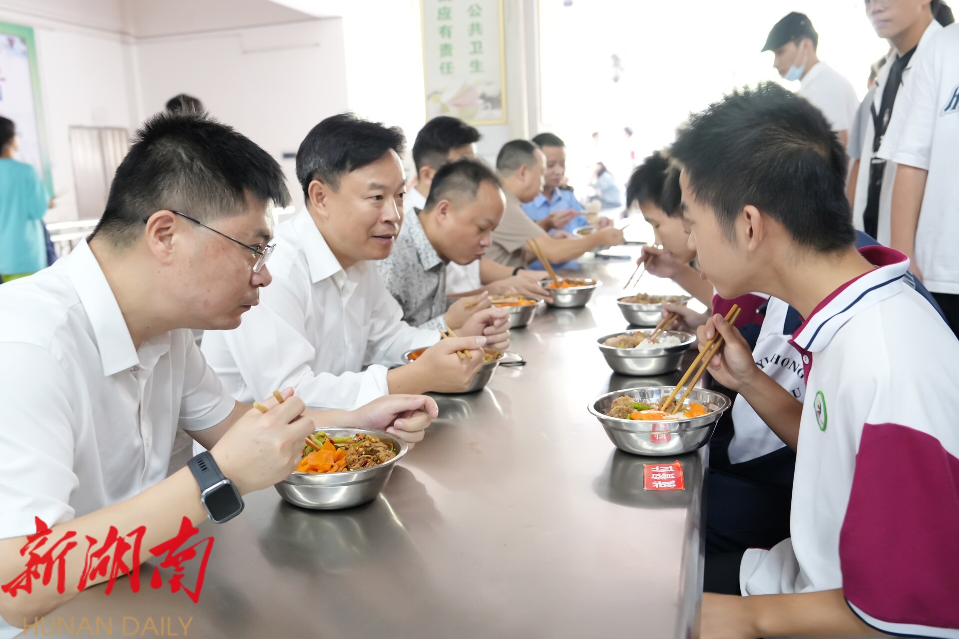 当天中午,吴韬一行在洞口一中北校区食堂与学生共同用餐,亲身体验餐品质量与口味,并与学生交流用餐感受。他指出,要持续优化供餐机制,加强营养管理,推动“校园餐”从“吃得饱”向“吃得好、吃得健康”转变,真正让学生满意、家长放心。