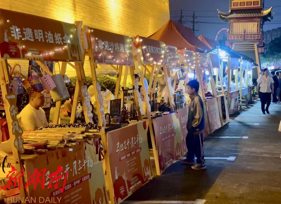 舞台表演精彩纷呈 ,台下“烟火市集”同样人气爆棚。糖画摊前,孩子们踮脚围观,非遗传承人手腕轻转,金黄糖汁在画板上流动,转眼一只活泼可爱的玉兔跃然眼前;捞刀河刀剪展位前,市级非遗传承人一边展示刀剪,一边讲解锻造技艺,传递出老手艺的匠心;助残义卖摊前,居民们纷纷选购布艺玩偶与串珠手链,每一笔交易都承载着浓浓的爱心。