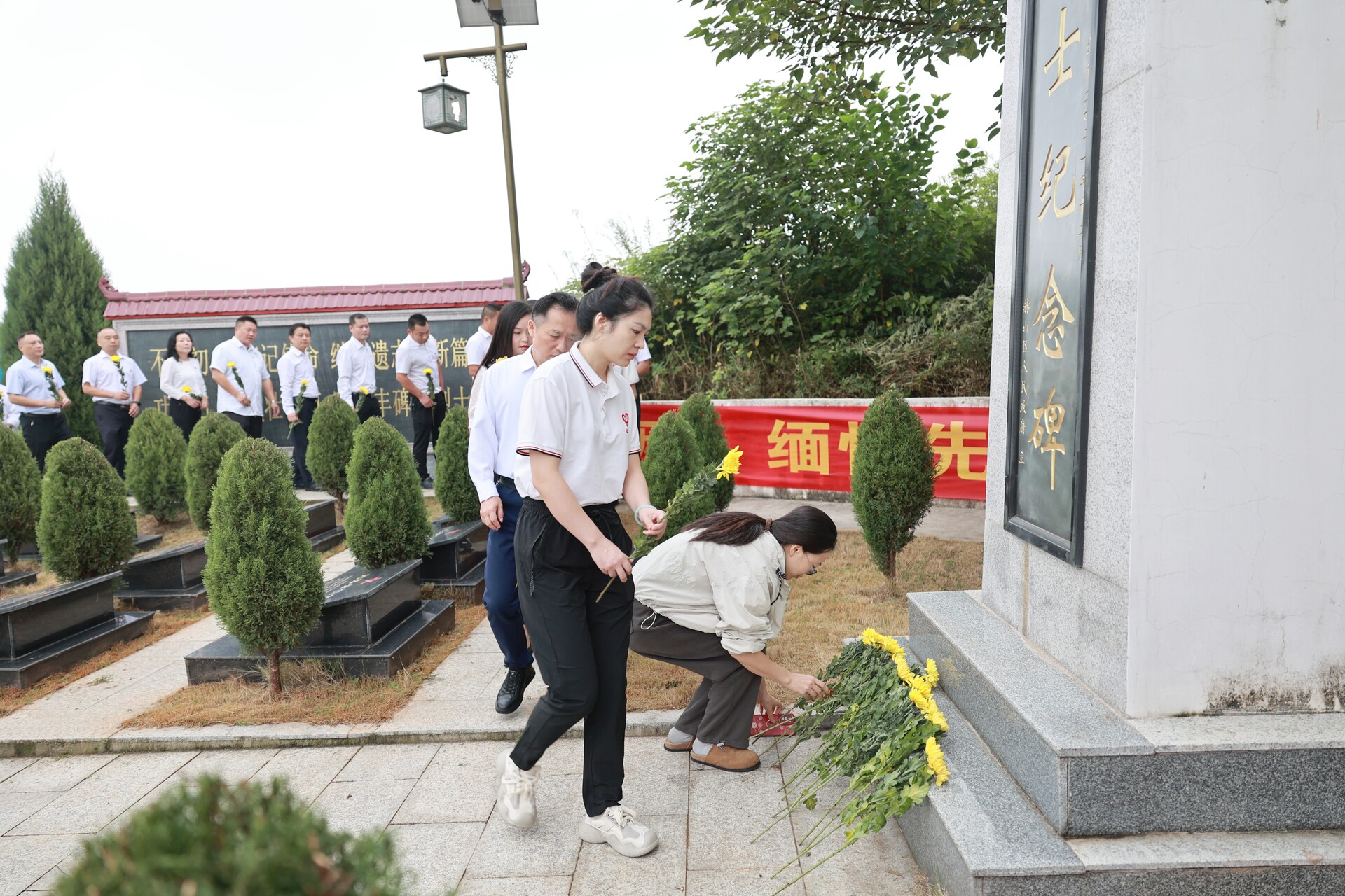 上午9点,活动在嘹亮雄壮的国歌声中拉开序幕。全体人员列队整齐、肃立默哀,传递着对先烈的敬仰之情、对英雄的缅怀之意。工作人员向革命烈士先辈敬献花篮,曾玉彬上前整理花篮缎带,向革命烈士表达崇高的敬意。随后,参加活动的全体人员排列整齐,缓步来到纪念碑前,献上鲜花,瞻仰烈士纪念碑,追思先烈们艰苦奋斗的革命历程。