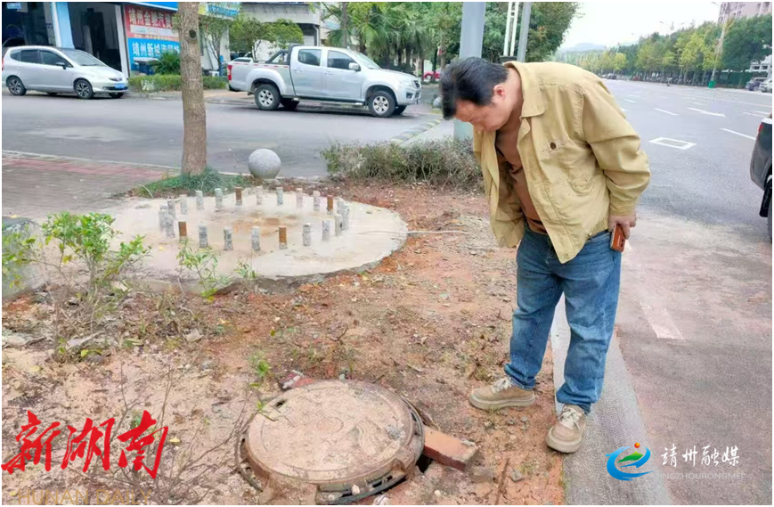 工作人员巡查、处理破损井盖(阳辉 供图)