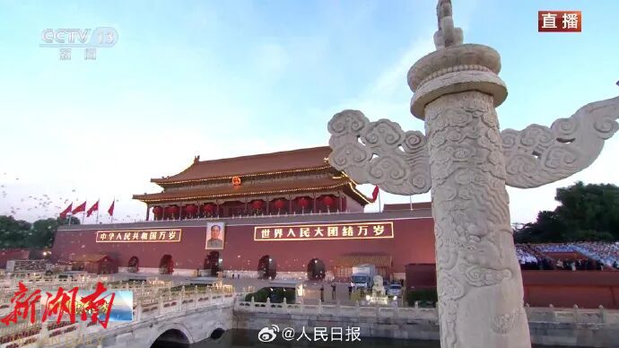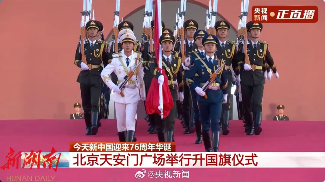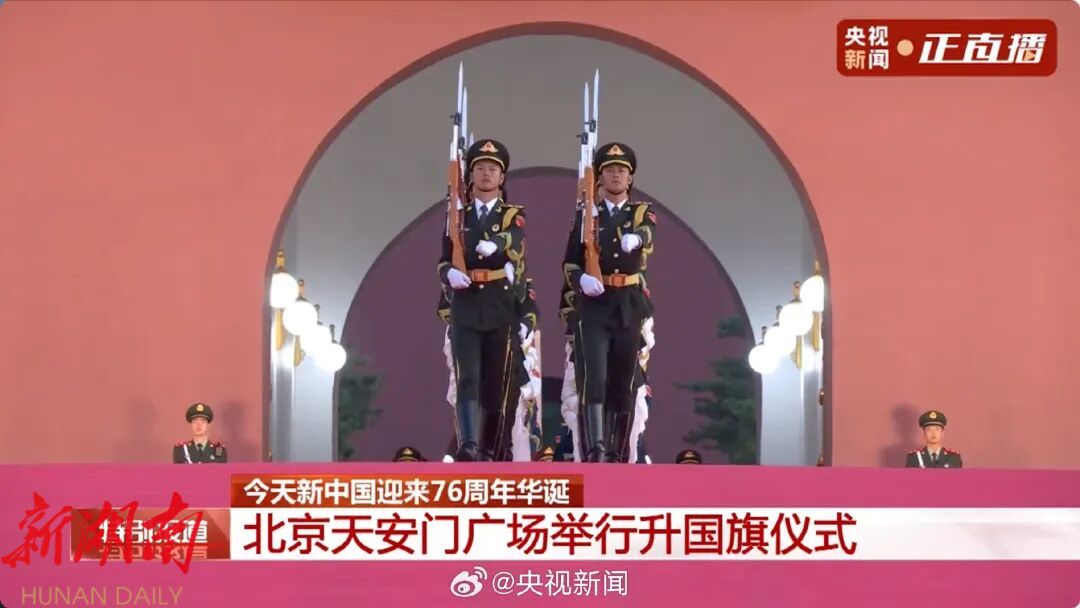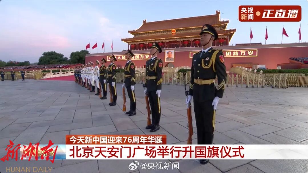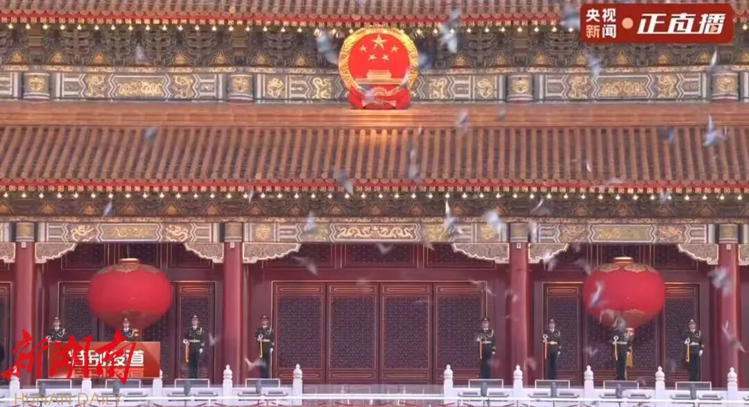 早上 6 点 11 分,现场的军乐队奏响国歌。五星红旗升起后,现场还放飞了 1 万羽白鸽。