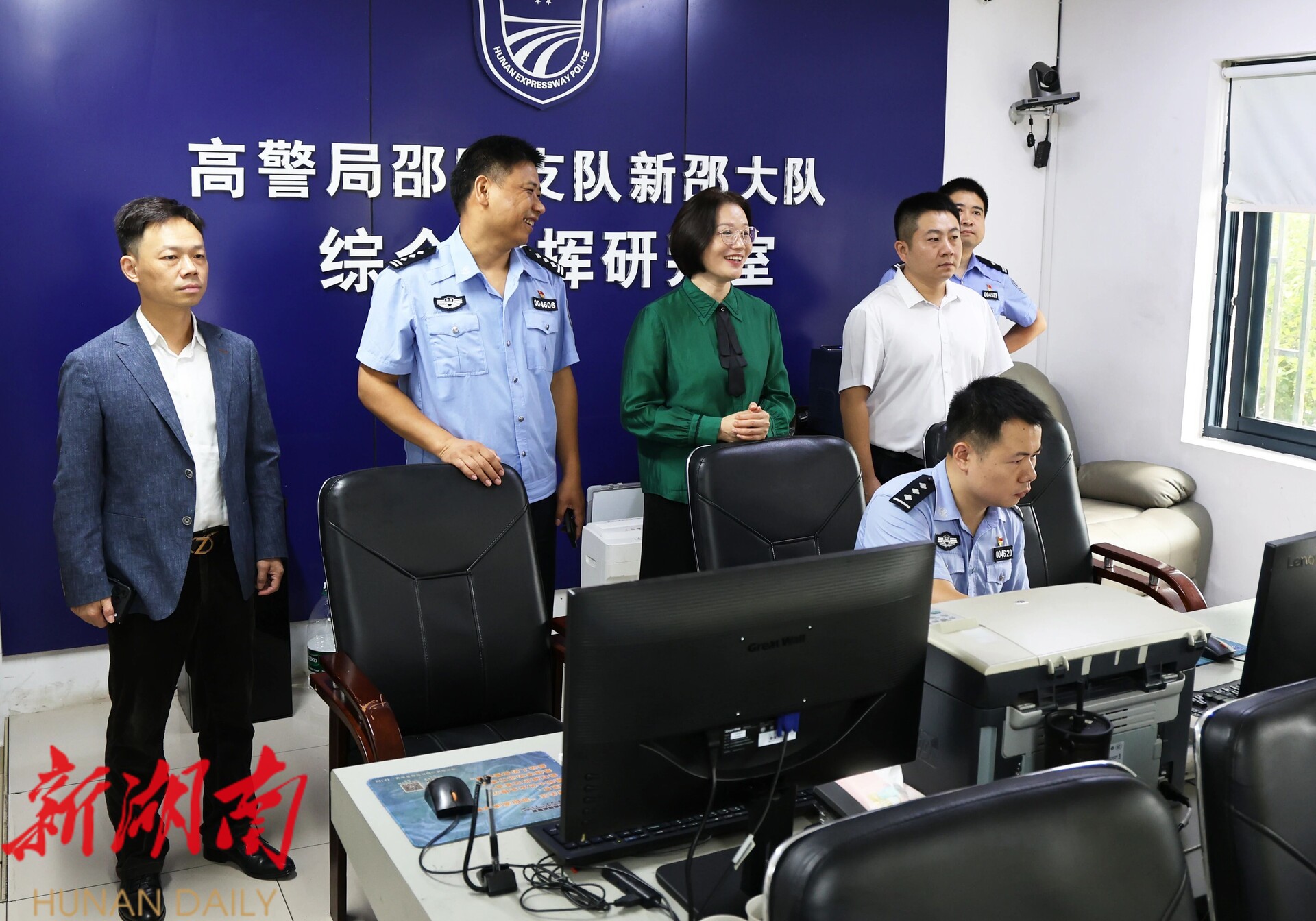 在高速交警新邵大队,黄海蓉亲切看望慰问一线交警,听取大队主要负责人汇报安防、设备、客流量、值班值守等相关情况,并到综合指挥研判室通过监控画面详细了解辖区高速公路安全情况。她指出,道路交通安全事关人民群众生命财产安全,要强化路面管控,严把重要关口,加强高速公路出入口等重点部位视频监测,密切关注道路车流高峰,强化信息沟通和研判预警,做好值班值守,努力为群众安全出行创造良好的道路交通安全环境。