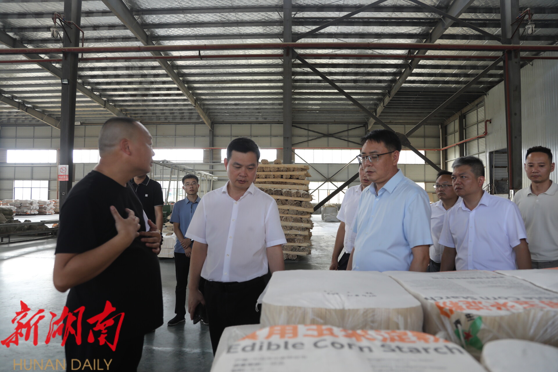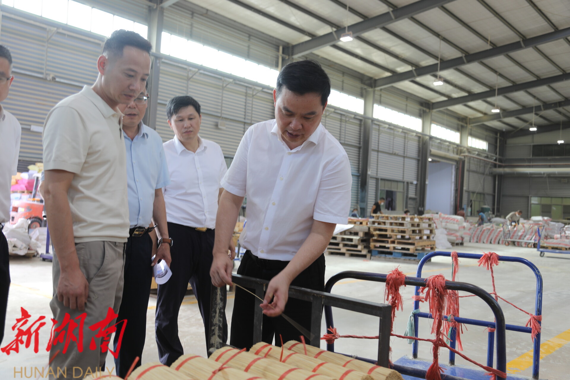 图为县委书记何德波在湖南悟康竹业有限公司调研