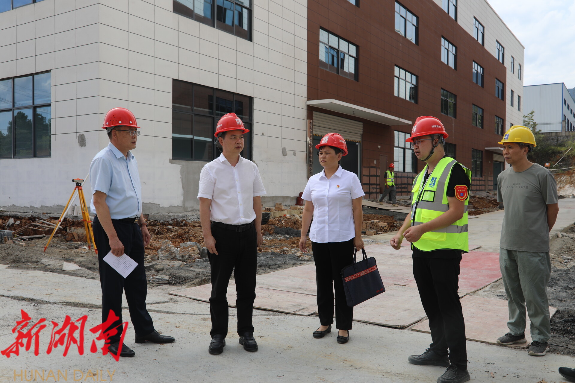 图为县委书记何德波在邵阳三信电子科技有限公司锂电池生产项目施工现场调研