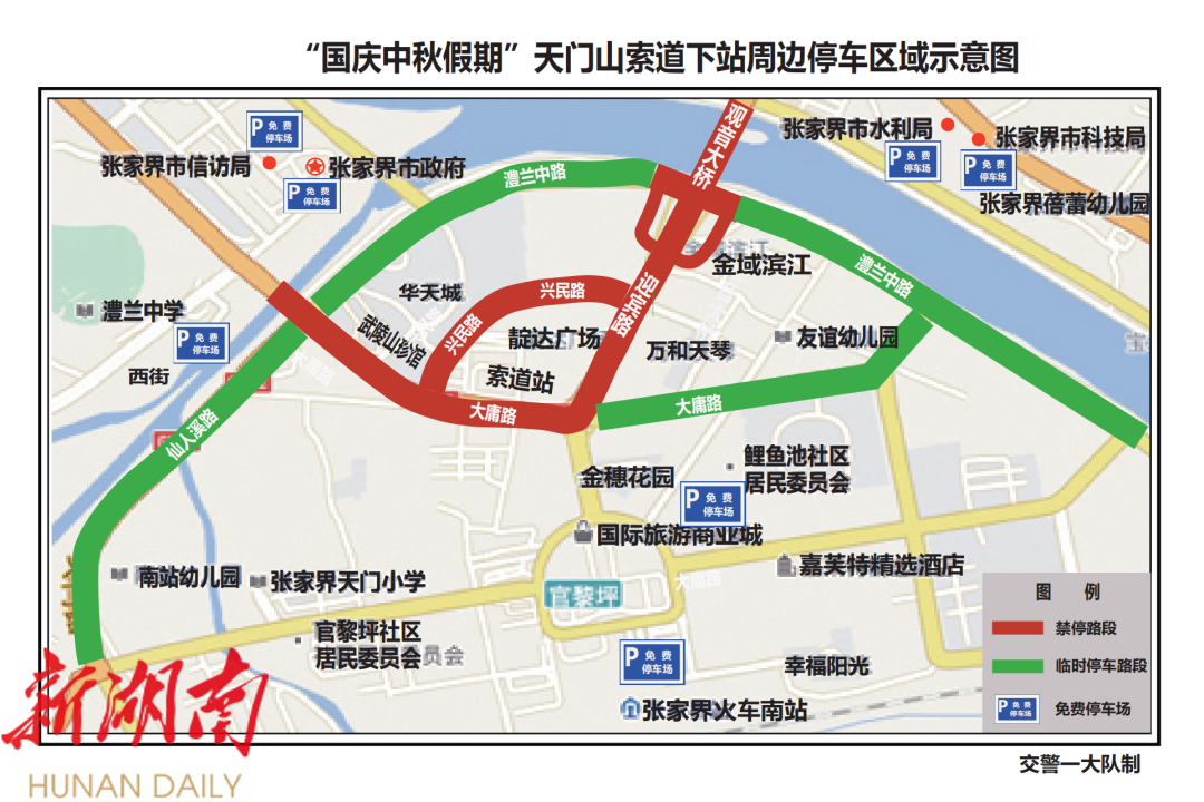 (一)天门山索道公司下站外地车辆临时停放路段:1、澧兰中路两侧道路靠右侧停放;2、大庸路两侧道路靠右侧停放;3、仙人溪路两侧道路靠右侧停放。