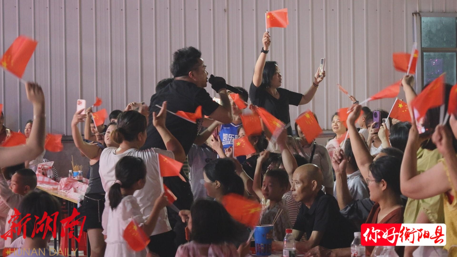 夜幕降临,梅花乐园灯光璀璨、人潮涌动,炭火升腾间,烤串等美食香气四溢。在游客们的欢呼声中,音乐烧烤节拉开序幕,乐队和歌手轮番登场,为游客带来动听的音乐和动感十足的舞蹈,赢得掌声如潮,现场仿佛一片欢乐的海洋。全体游客和村民还挥舞手中的小红旗,齐唱《歌唱祖国》等经典歌曲,用嘹亮的歌声为祖国庆生,将现场气氛推向高潮。