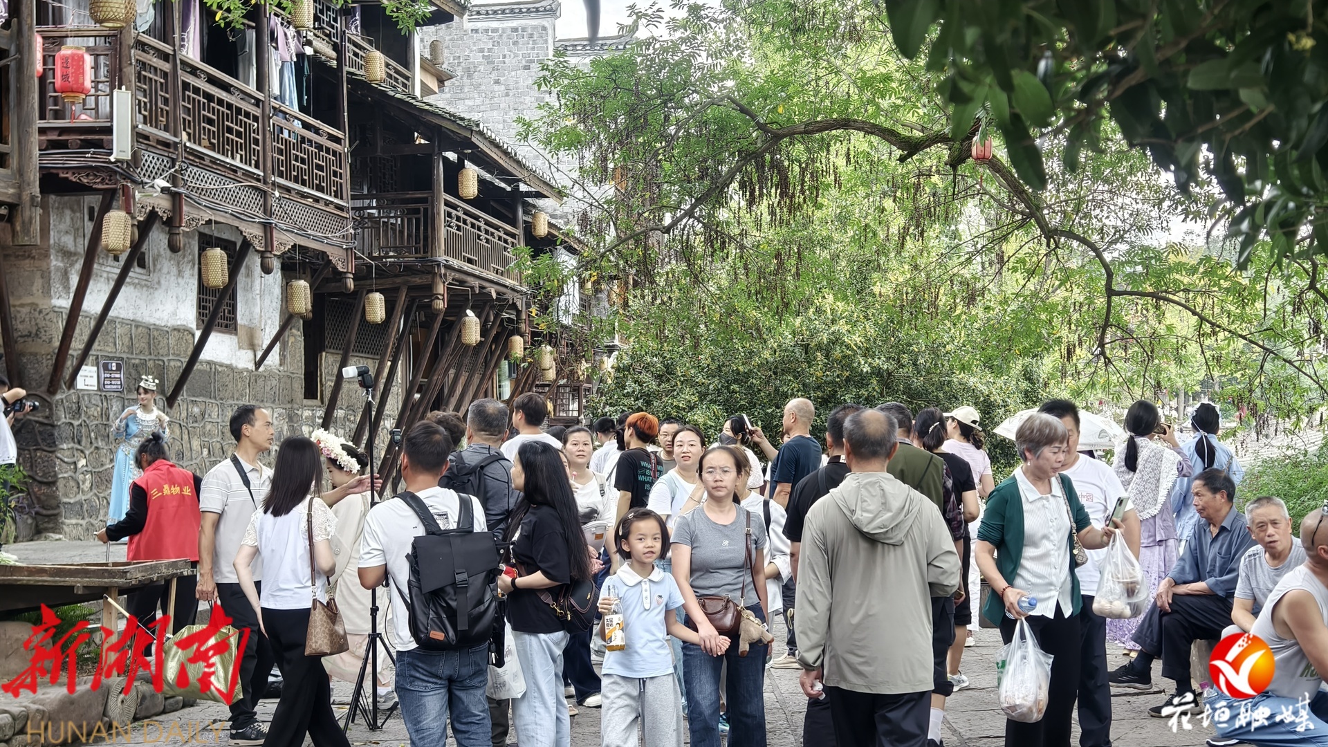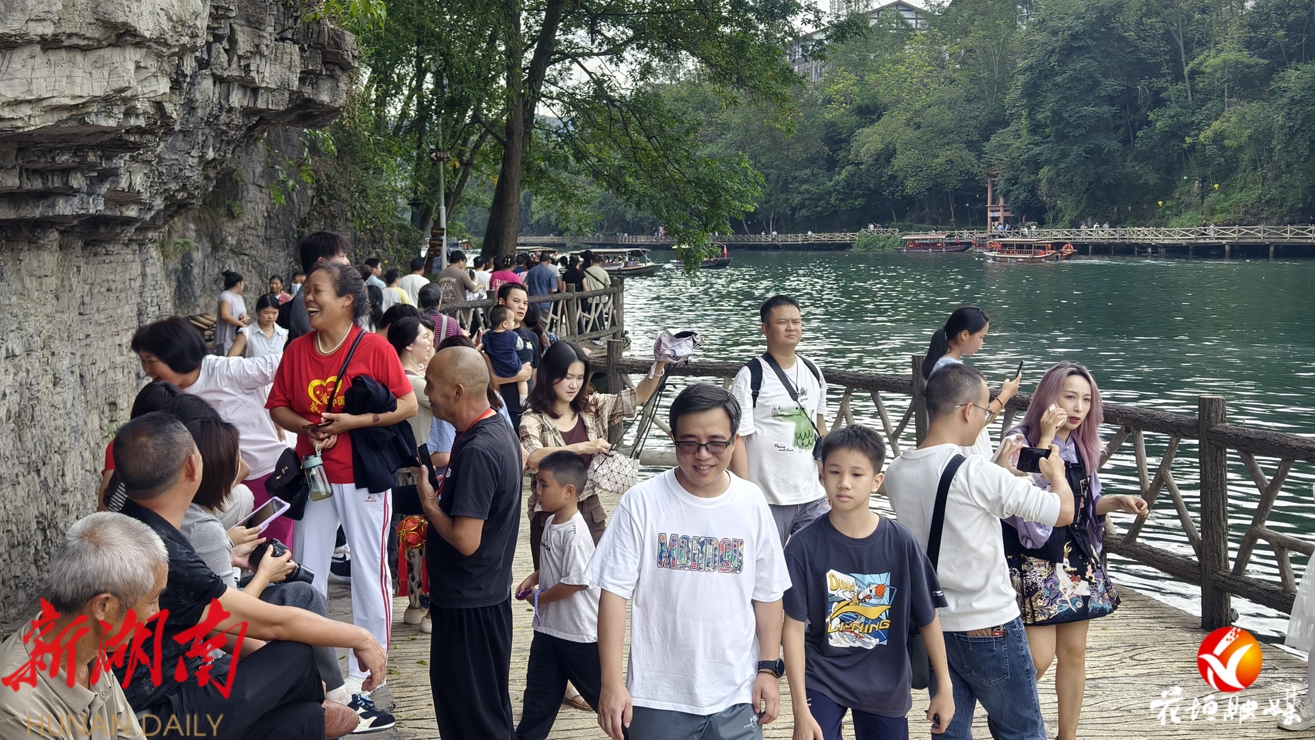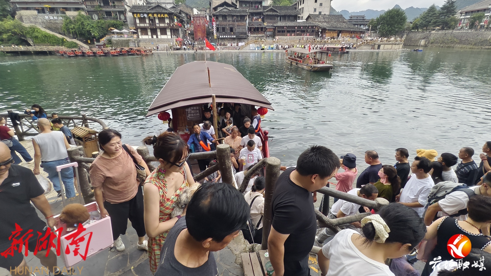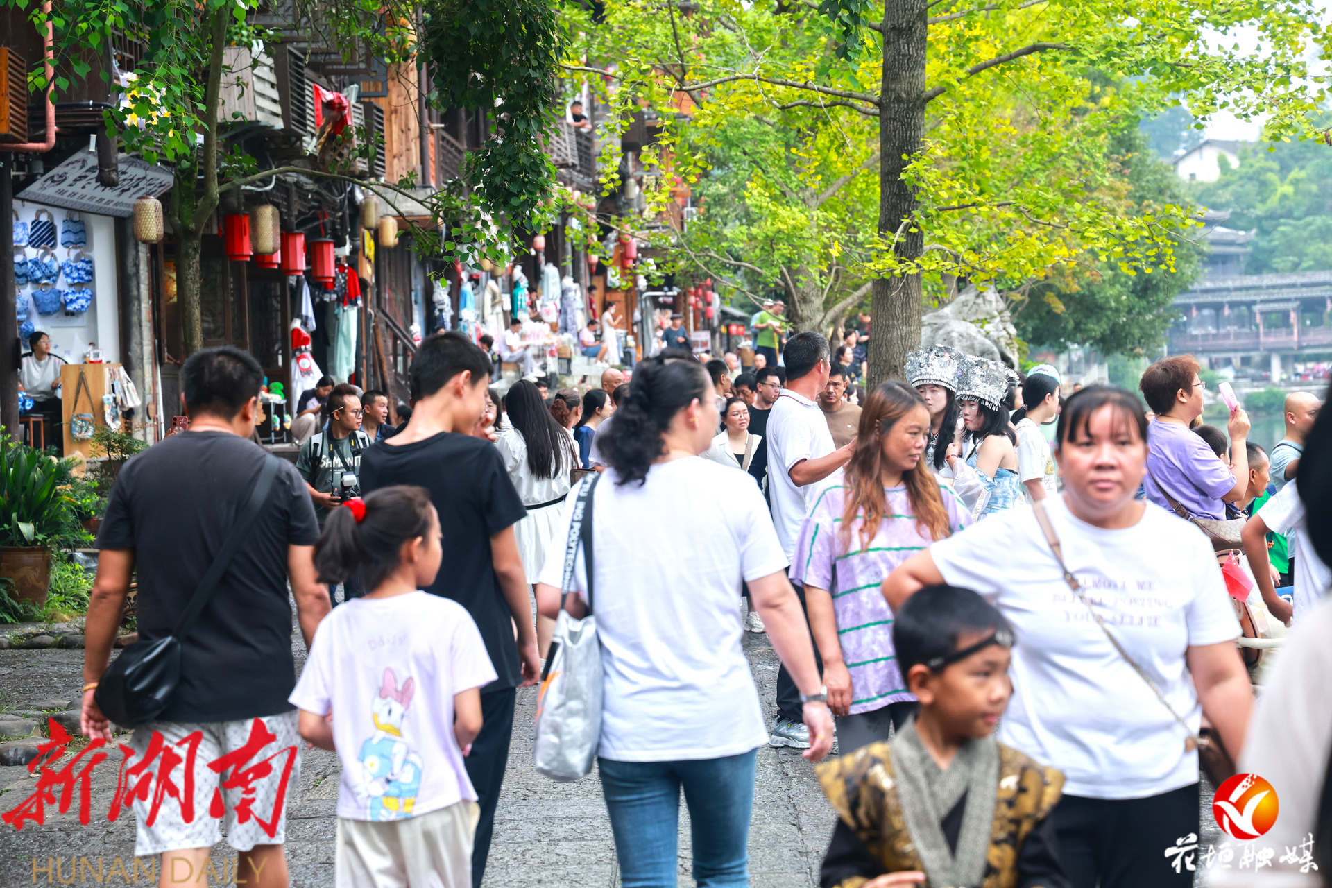 湖南日报·新湖南客户端10月2日讯(通讯员 邓雨露 张庆港 林彬 石林荣)10月1日,国庆中秋假期首日,花垣县边城茶峒景区迎来全国各地的游客。静谧的山水与熙攘的游客相映成趣,沈从文笔下的文学世界在节日中焕发出勃勃生机。