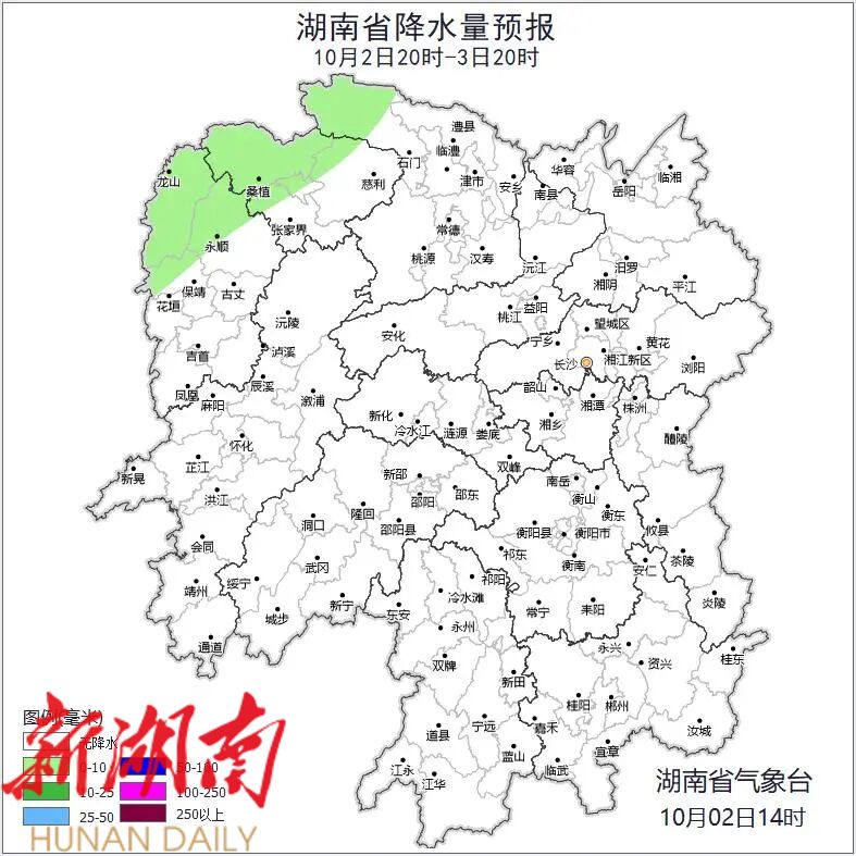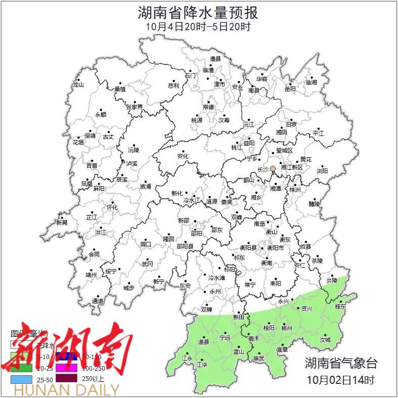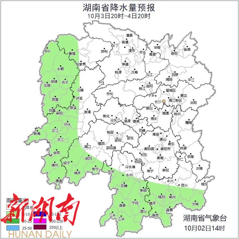 10月3日晚上至4日白天,多云间晴天,湘西、湘南部分地区有阵雨或雷阵雨;湘中以北北风2~3级,其他地区南风2~3级;最高气温湘西、湘北27~32℃,其他地区33~35℃,最低气温19~24℃。