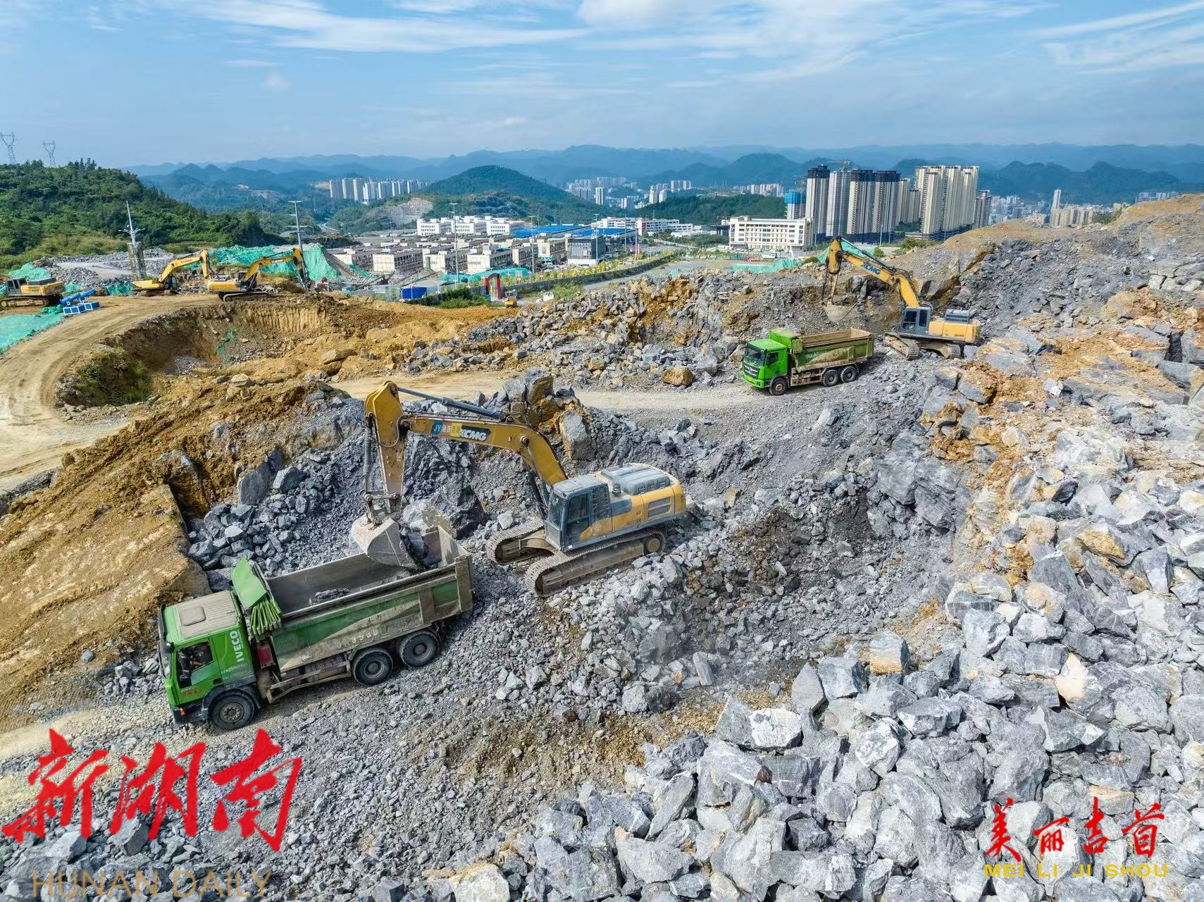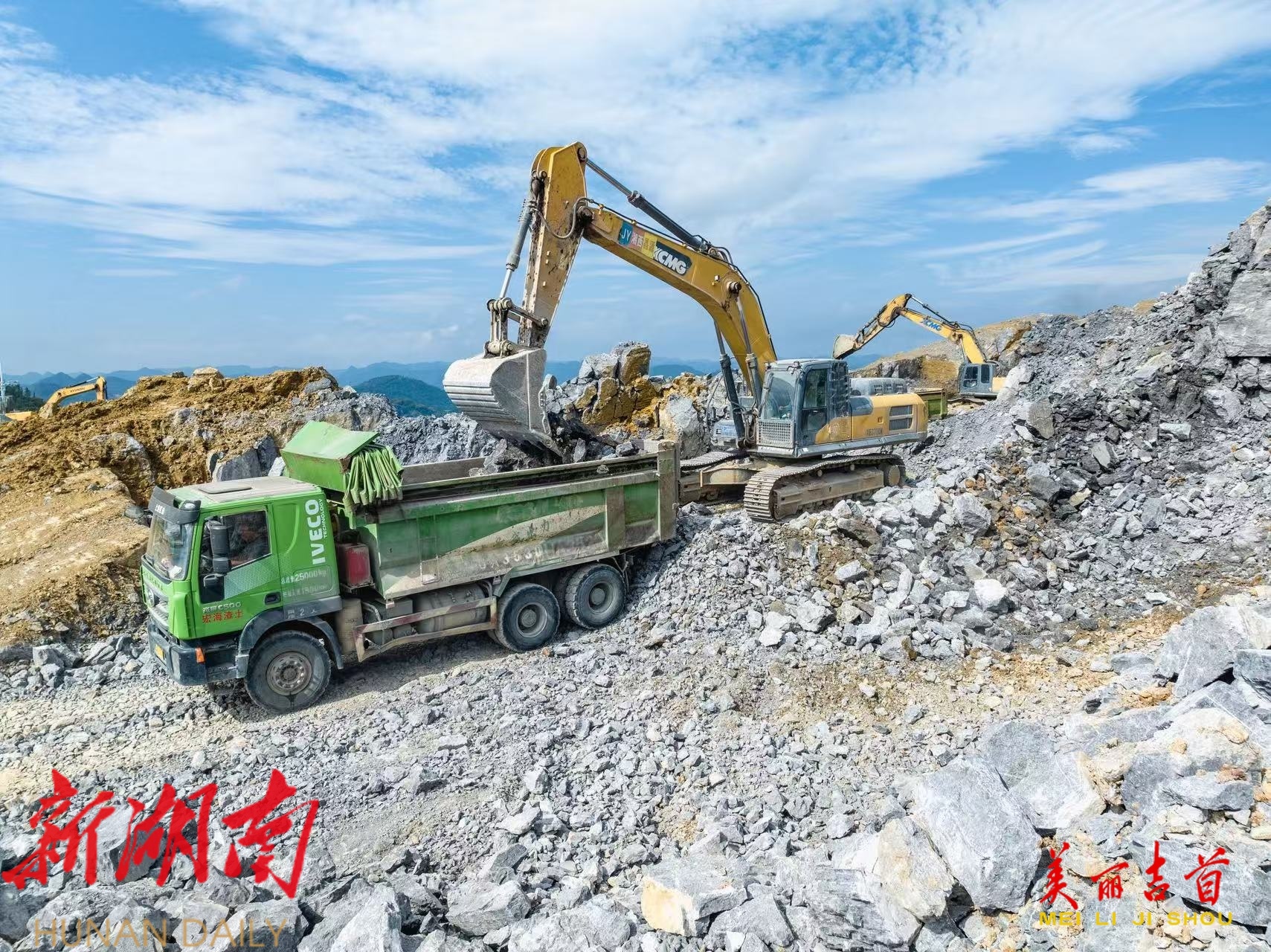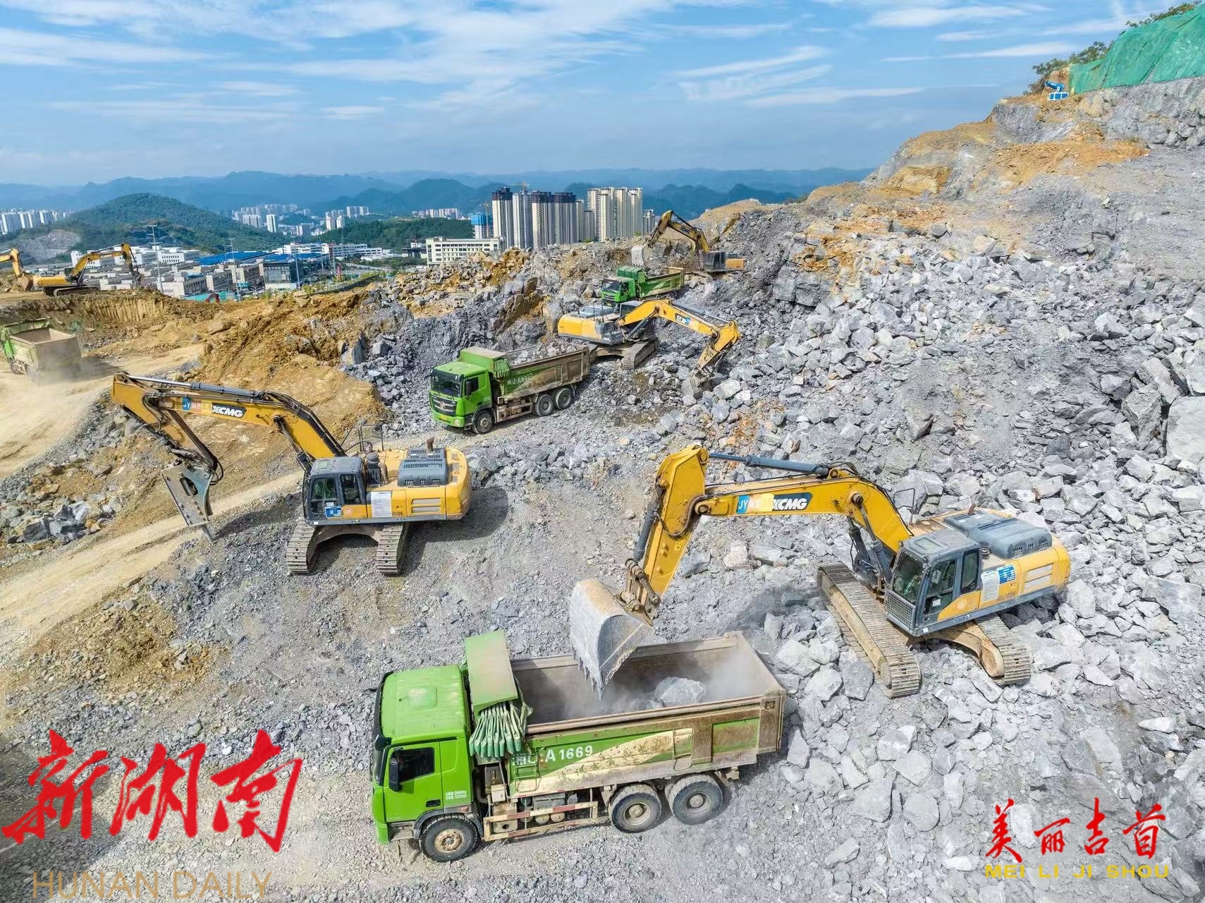 10月2日,吉首市建筑材料产业园项目工地,建设者操作挖掘机在施工作业,工程车来回穿梭,现场一派繁忙。国庆中秋长假,吉首市重点工程项目的建设者们坚守岗位,在忙碌的辛勤劳动中度过假期,全力以赴推进工程建设。