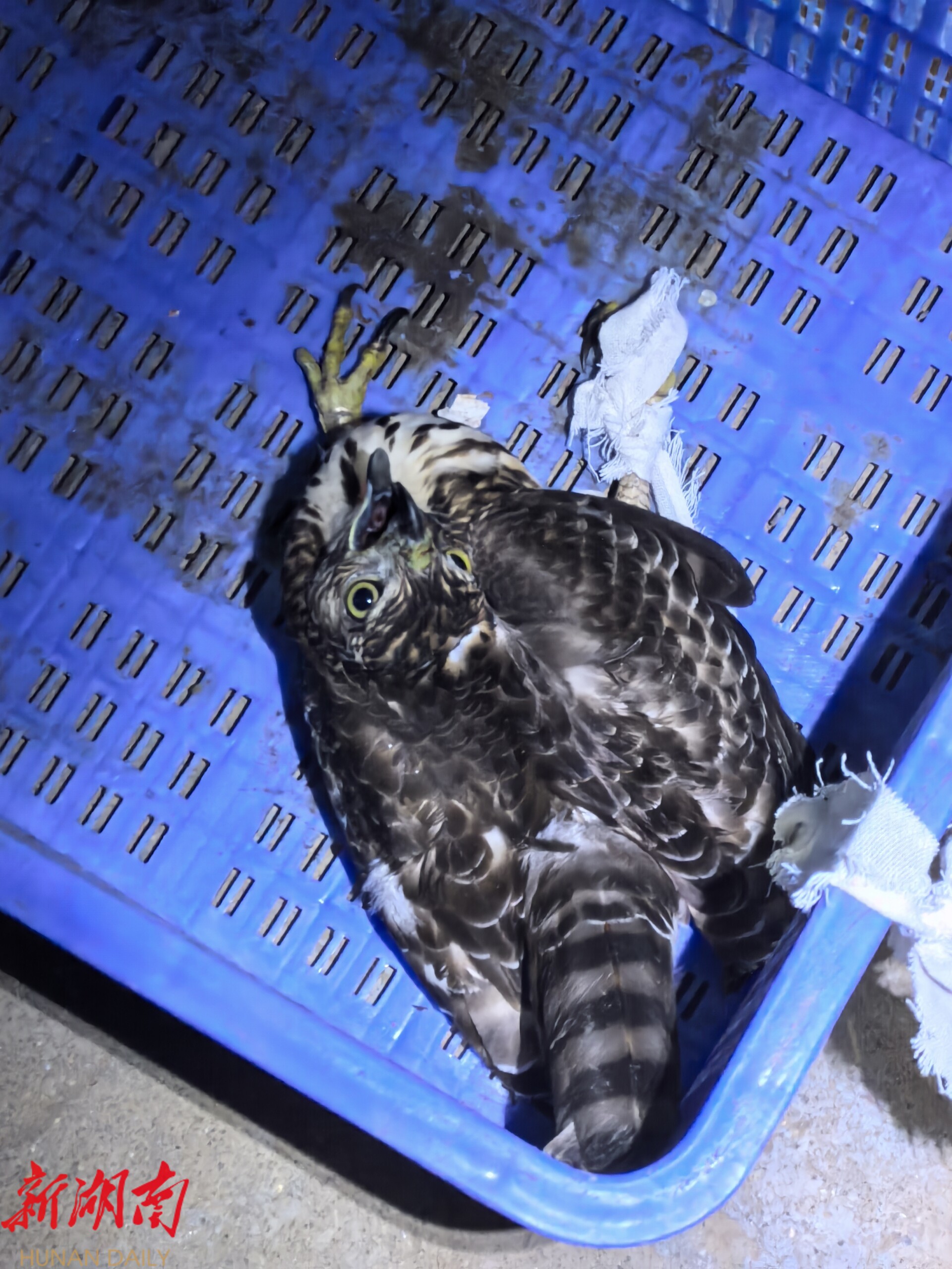 随后,李振昂及时联系了湘阴县林业局野生动物救护中心。经工作人员现场辨认,确认这只“大鸟”为国家二级保护动物——苍鹰。目前,苍鹰已被接回救护中心接受进一步治疗与康复照料,待其伤势痊愈、具备野外生存能力后,将择机放归自然。