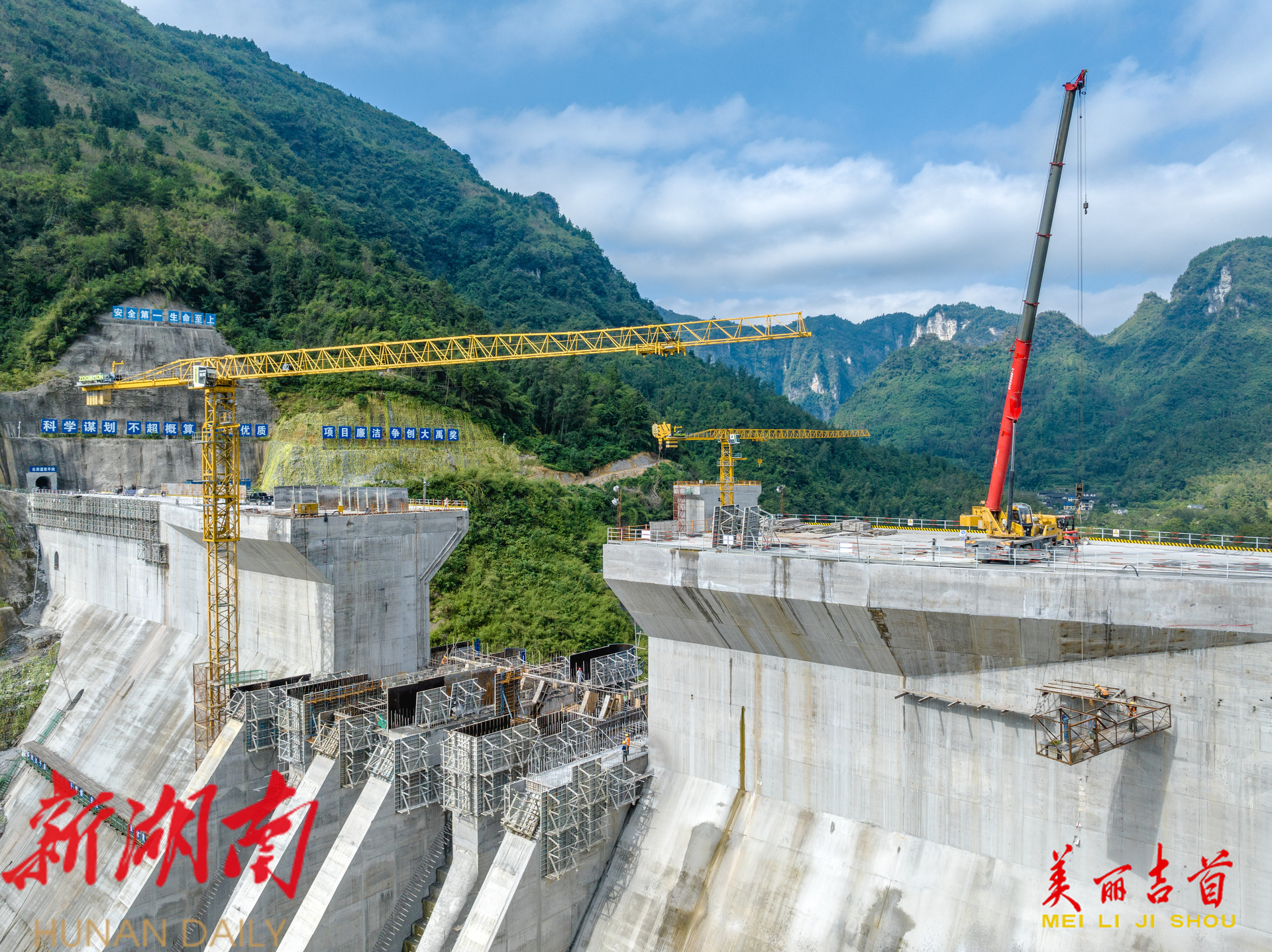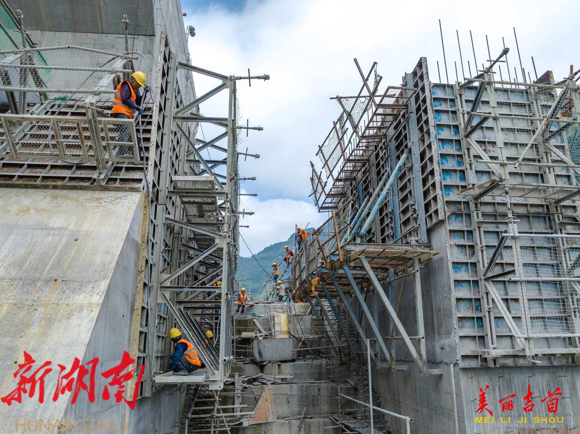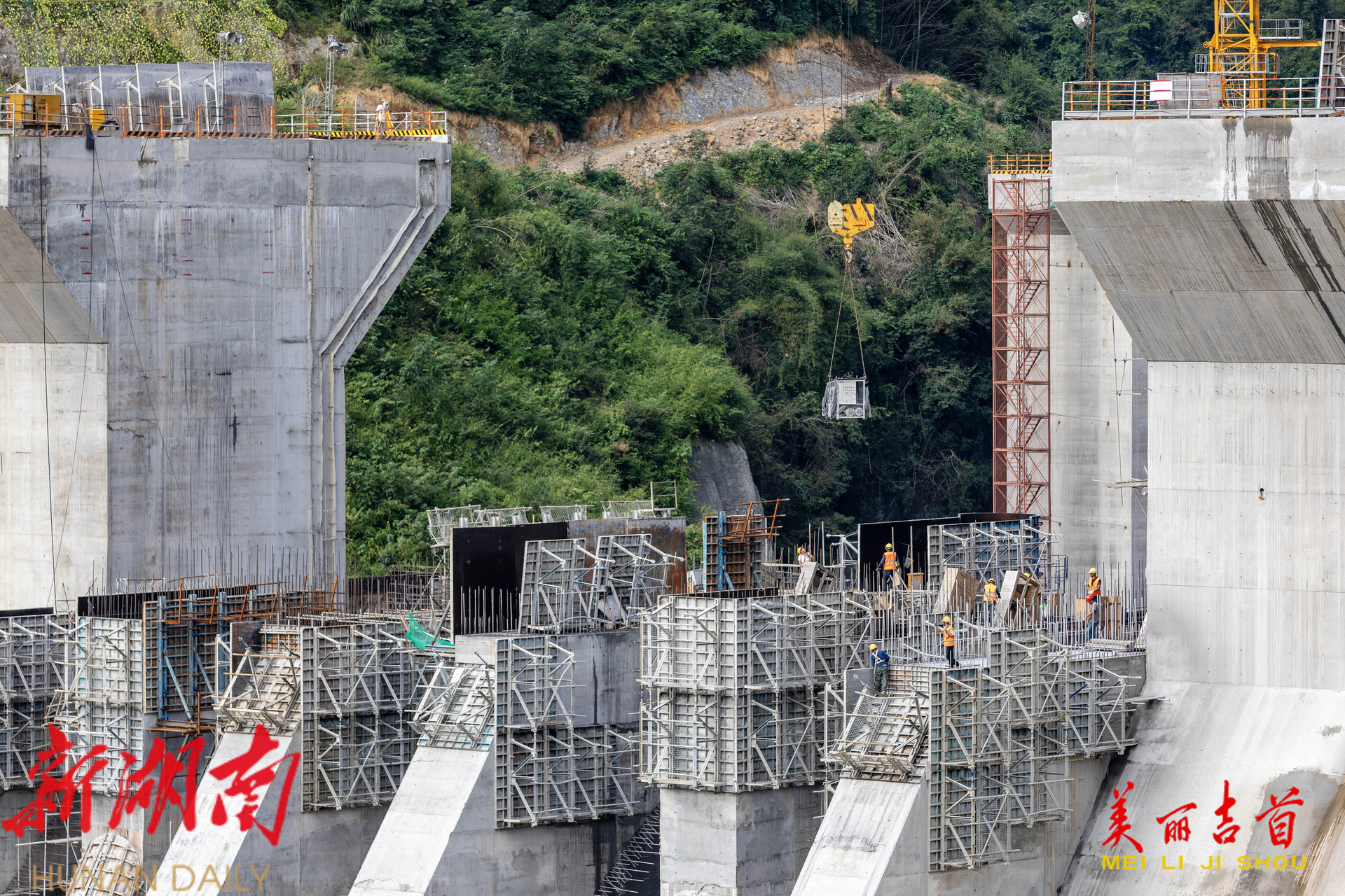吉首市融媒体中心10月5日讯(全媒体记者 彭璟) 2025年10月4日,吉首市矮寨镇大兴寨水库工程建设现场,工人正在进行8#9#溢流坝段施工。国庆中秋假期,该建设单位的劳动者们放弃休假,坚守岗位,确保重点水利工程项目顺利推进。