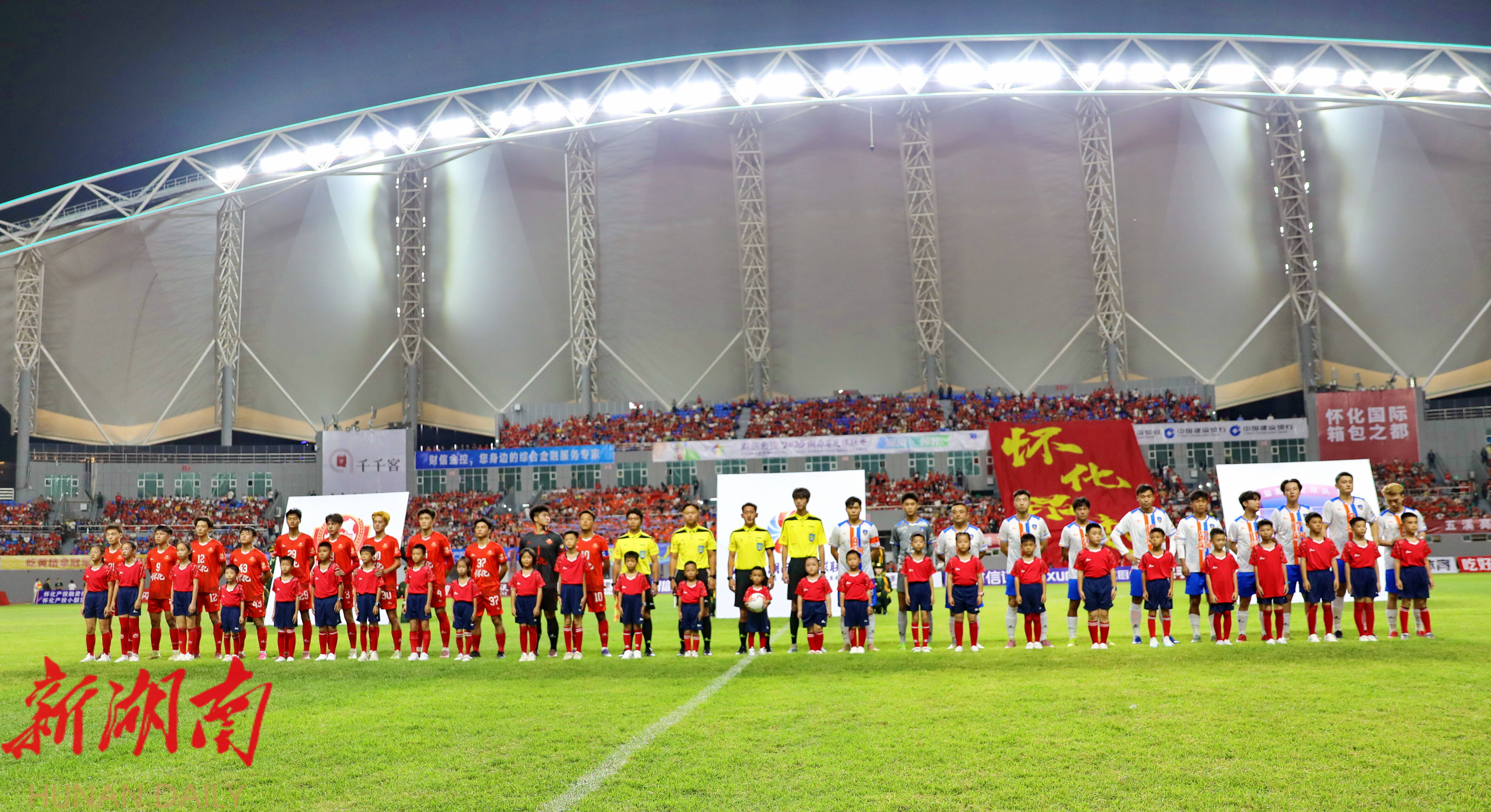 (10月4日19时38分,湘超联赛第四轮焦点战在怀化市体育中心打响。图为开赛前怀化队、益阳队与裁判组列队完成赛前合影。怀化日报全媒体记者 彭军 摄)