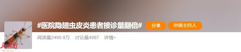 近日,一则“医院隐翅虫皮炎患者接诊量翻倍”的新闻登上热搜。济南多个区域出现被称为“飞行的硫酸”的隐翅虫袭击, 不少市民因徒手拍打、误触虫体而引发皮肤水疱、破溃等症状。据山东大学齐鲁医院皮肤科消息,近期隐翅虫皮炎患者接诊量较以往增长一倍,提醒广大市民注意。