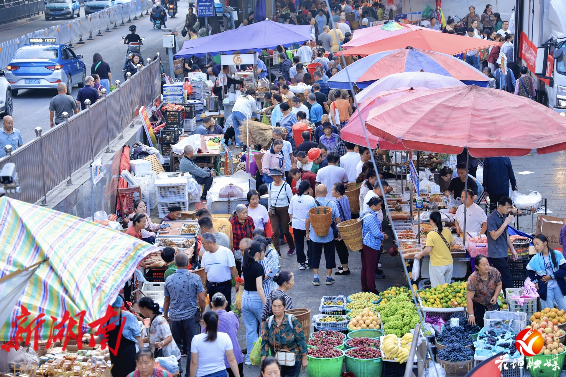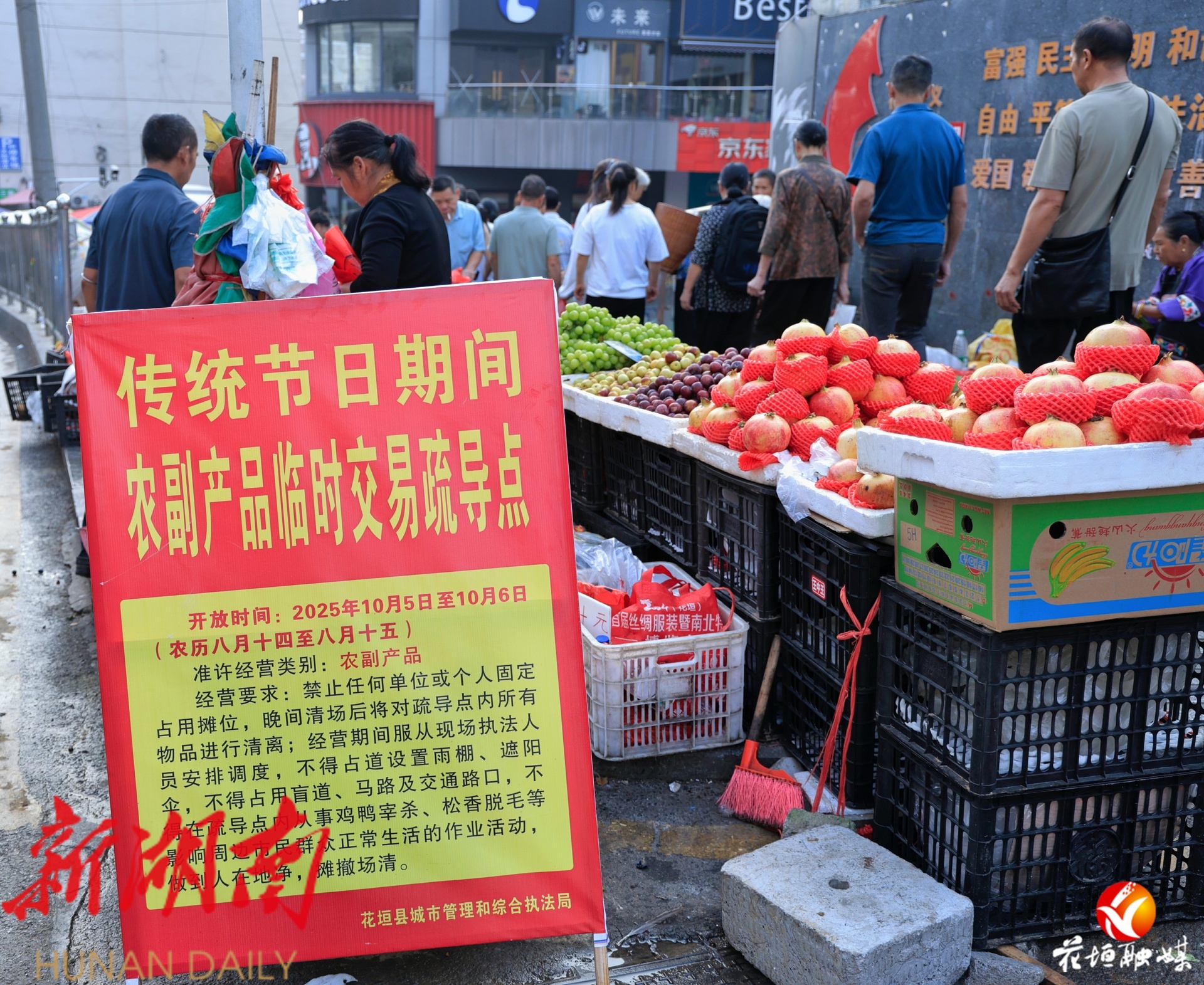 湖南日报·新湖南客户端10月6日讯(通讯员 肖引霞 ) 中秋佳节至,又是一年团圆时。为满足市民节日采购需求,激发市场消费活力,今年中秋节,花垣县在城区科学设置4处中秋节期间城区农副产品临时交易疏导点,既守护城市“整洁线”,又点燃街头“烟火气”,让市民在规范有序的环境中“买得方便、吃得放心、玩得开心”。