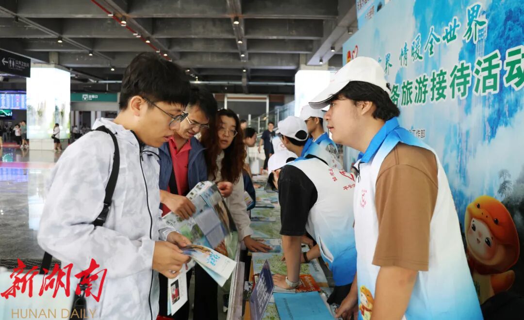 张家界西站是不少游客来张旅游的第一站,见到青年志愿者陈立时,他正忙着给刚下高铁的游客规划路线。陈立告诉记者,为了做好志愿服务,他和其他的青年志愿者们不仅提前背熟了交通线路、门票优惠政策,还会结合自身的游玩体验给游客提一些小建议。