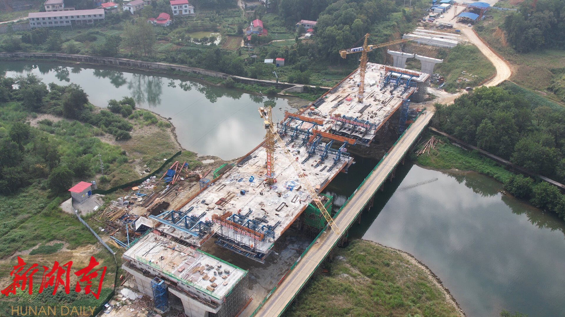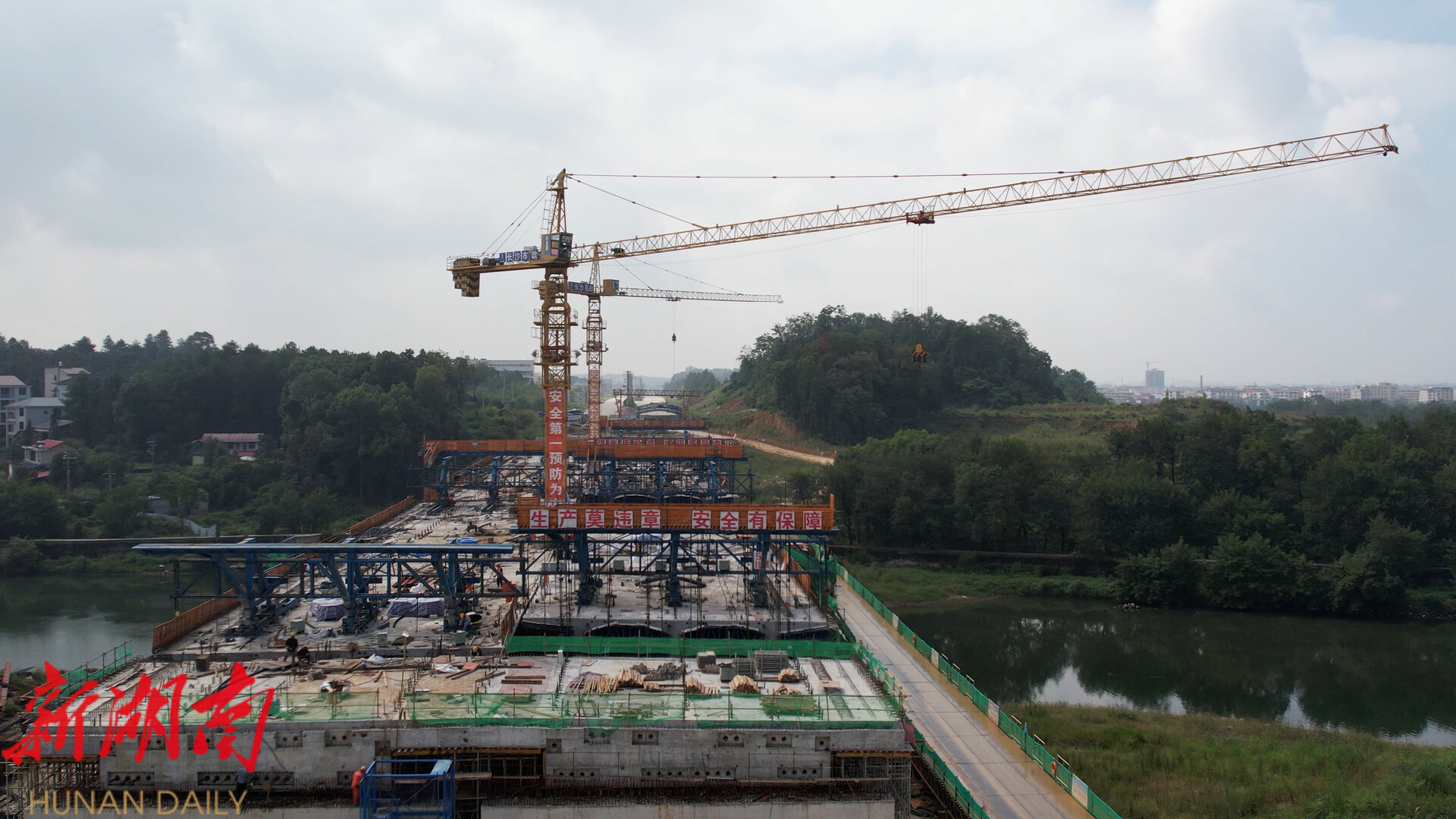 洞口四桥全长1395米,主要内容包含了两座桥梁工程,平溪江大桥和富水中桥,其中平溪江大桥和富水中桥的引桥采用的是预制梁,主桥采用的是悬臂挂篮施工,主桥的跨度是80+53+53,是缓解县城南部和周边县市通往洞口高铁站车流拥堵问题的关键枢纽,对高铁新城建设、承接经济辐射和推动全县经济高质量发展具有重要意义。
