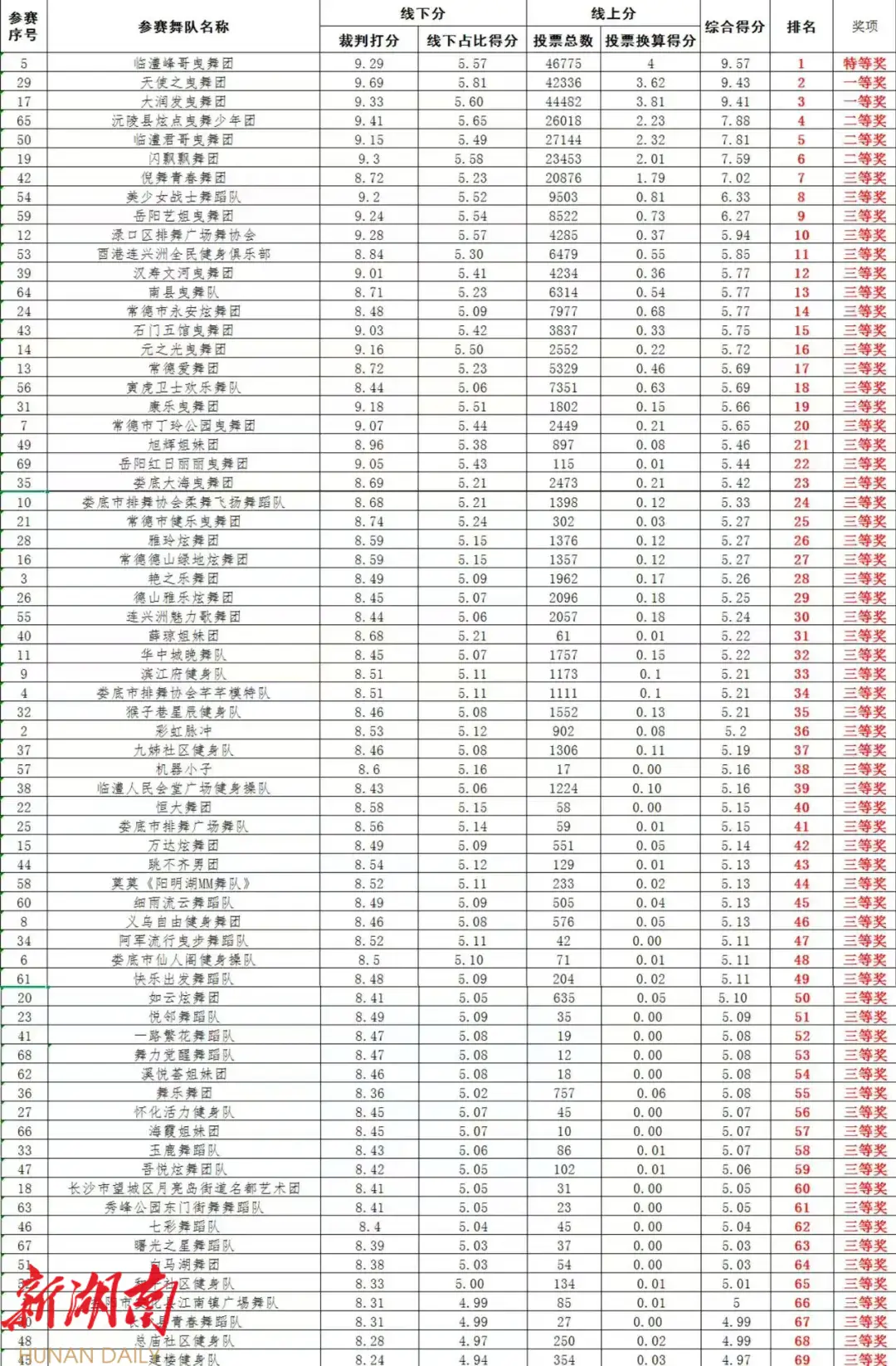 根据组委会评分规则,比赛成绩由线下专业评委评分和线上网络投票两部分组成。10月4日上午8时至 10月 7日18时,在常德日报微信公众号开启网络投票,经统计累计投出33万余张有效票。现将参赛队伍的得分及排名情况公布如下: