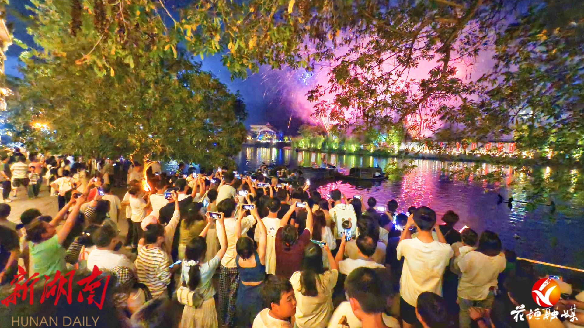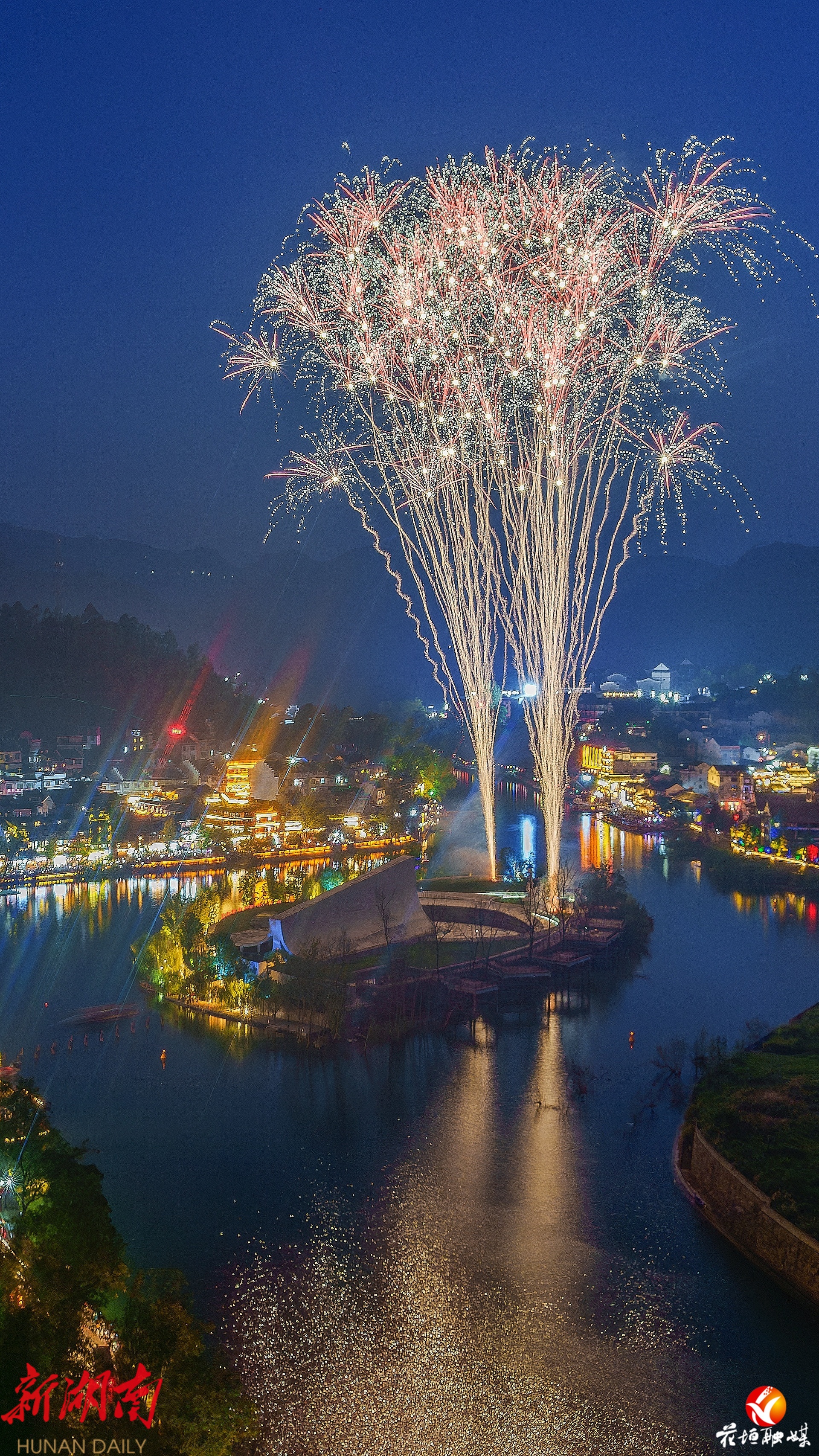 10月5日晚,翠翠岛上空绽放的绚烂烟花,将节日氛围推向最高潮。当第一束光芒划破夜空,金色“流星”轰然绽放,游客们不约而同地发出阵阵惊叹,纷纷举起手机记录这璀璨瞬间。“太震撼了!”来自重庆的摄影爱好者龙将军激动地说,“边城真的太美了,这趟来得特别值!”五彩斑斓的烟火在河面上交织出梦幻画卷,将沈从文笔下那个略带哀愁的文学世界,与今天这个生机盎然的现实边城完美相连。