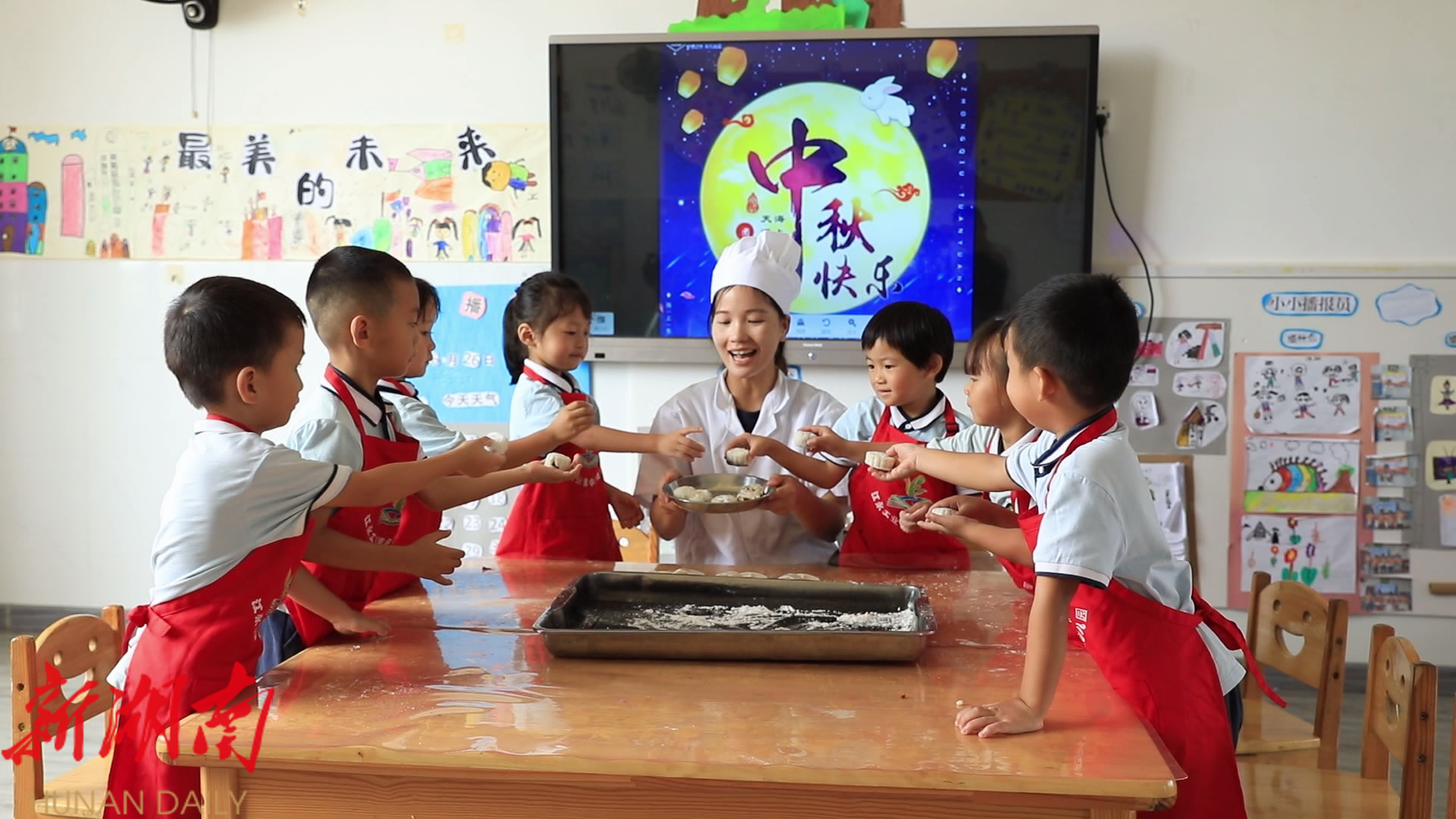 江永县工业区集中区幼儿园组织学生做月饼、制灯笼,培养学生动手实践能力,让学生在丰富多彩的德育实践活动中感悟中华传统文化,表达对节日的祝福。