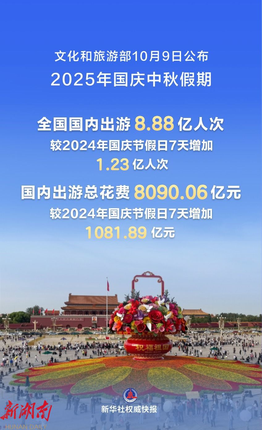 文化和旅游部10月9日公布2025年国庆中秋假期文化和旅游市场情况。经测算,假日8天,全国国内出游8.88亿人次,较2024年国庆节假日7天增加1.23亿人次;国内出游总花费8090.06亿元,较2024年国庆节假日7天增加1081.89亿元。