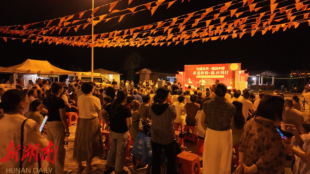 夜幕降临,水幕电影上映,为现场观众带来一场沉浸式视听盛宴。随后,“月满龙湾·情韵中秋”秋季村晚精彩上演,龙湾湿地艺术团的演员们带来的《乖咚乖》《锦绣梨园》等极具本土特色的歌舞节目,展现乡村文化活力;新化鑫华医院表演的《健康守护》情景剧,以贴近生活的剧情、生动的表演,讲述医护人员守护群众健康的故事,引发全场共鸣,将活动氛围推向高潮;随后的篝火晚会,村民们自发围拢在篝火旁,伴着欢快的音乐载歌载舞,在皎洁月光下分享团圆喜悦。