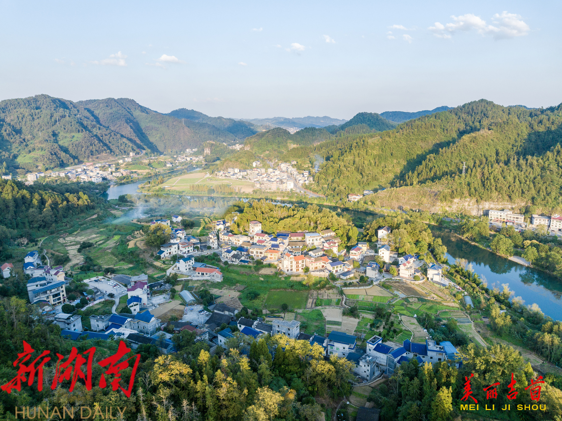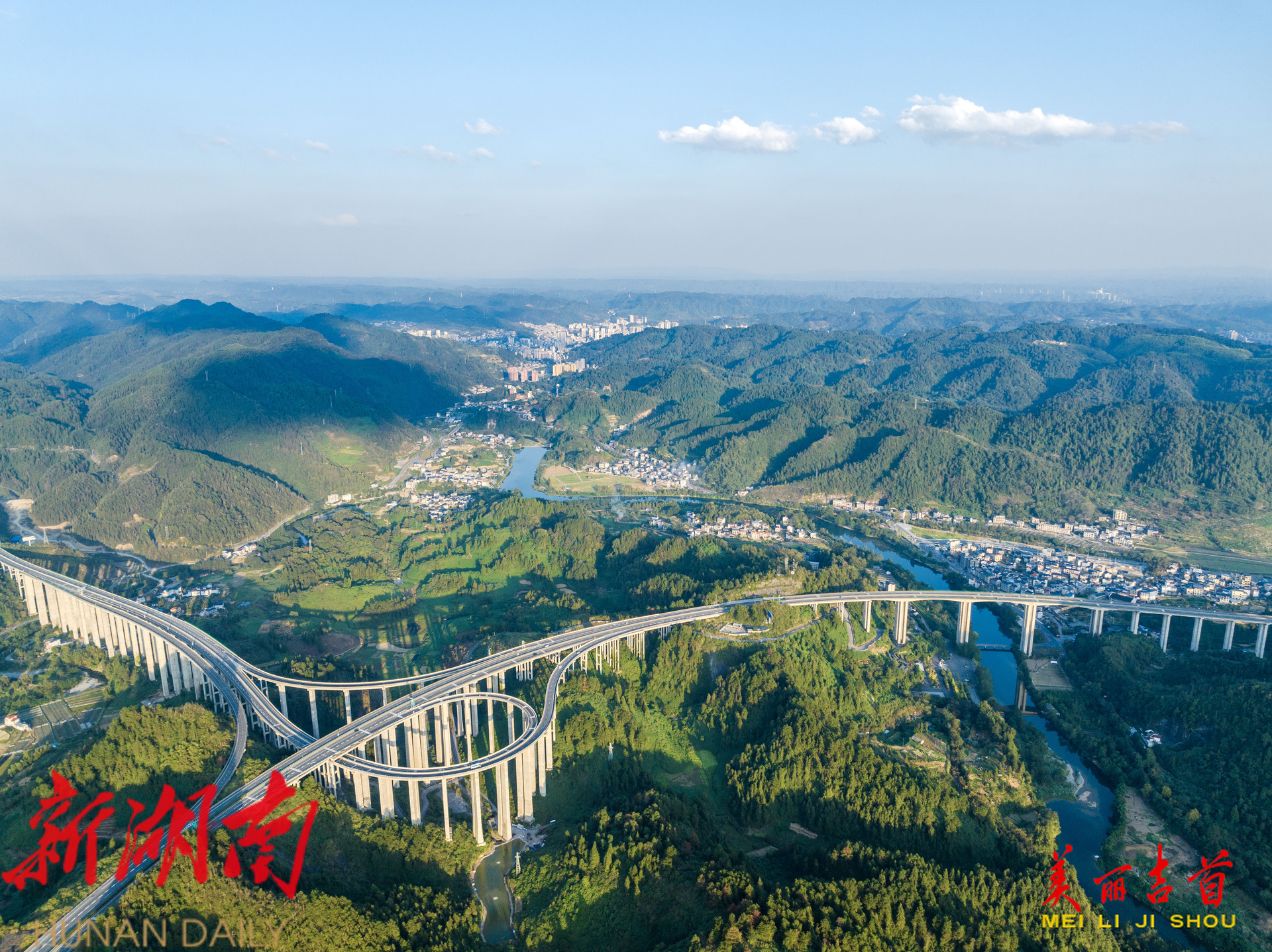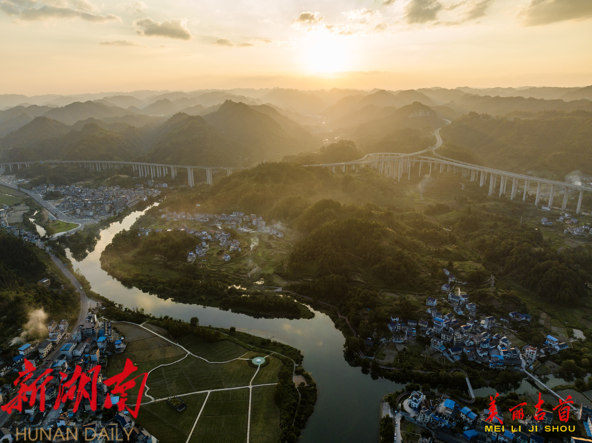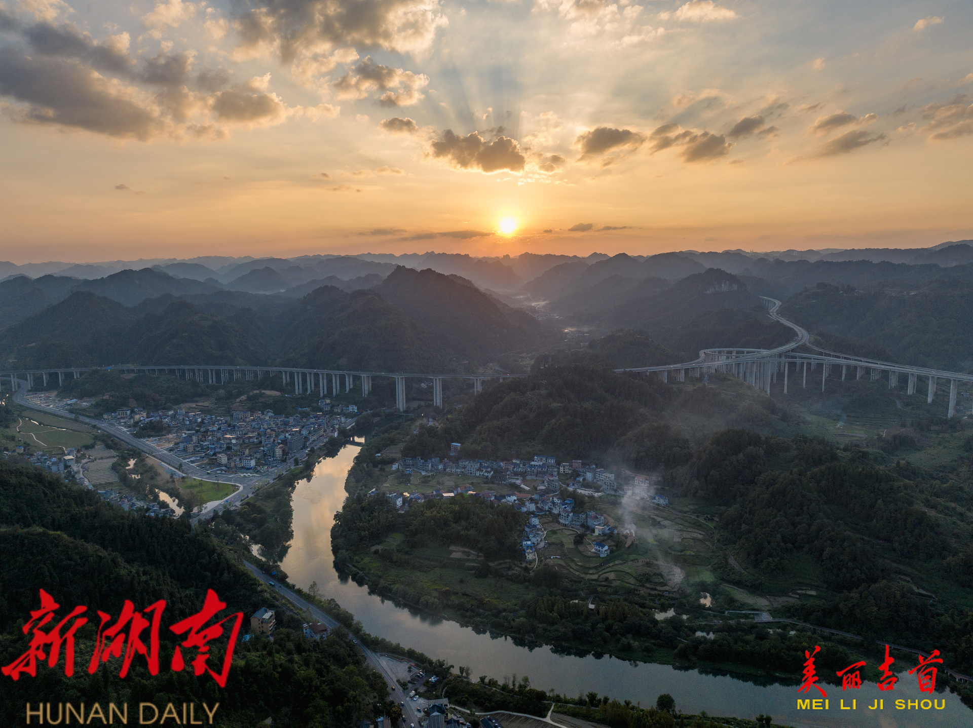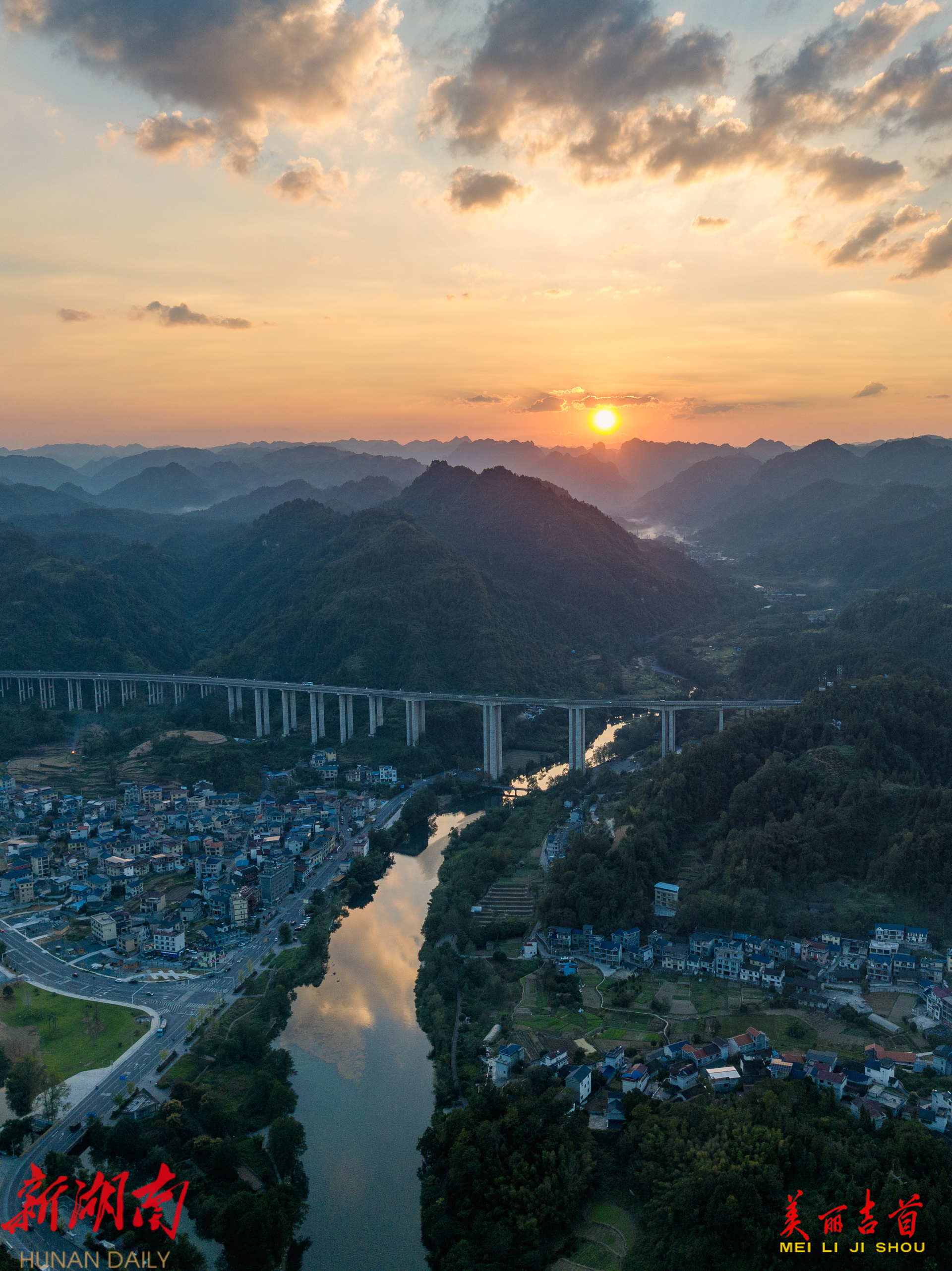 吉首市融媒体中心10月12日讯(全媒体记者 彭璟)10月11日,吉首市峒河国家湿地公园秋高气爽,在夕阳映照下,村庄、河流、山脉与高速公路构成了一幅和谐美丽的生态画卷。