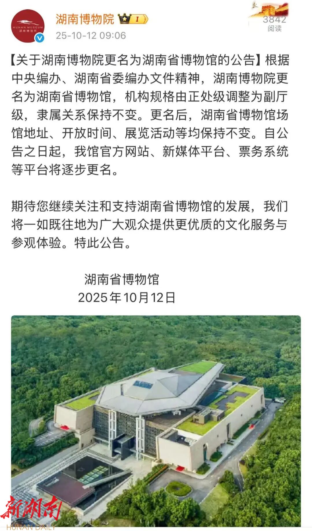 10月12日,湖南博物院发布 关于湖南博物院更名为湖南省博物馆的公告: