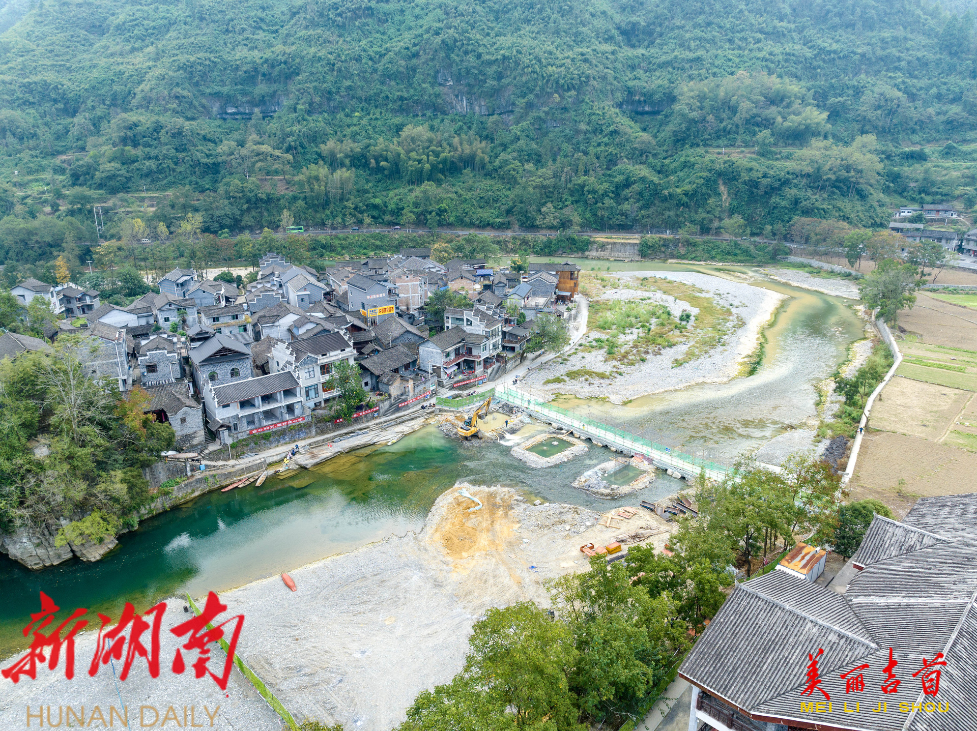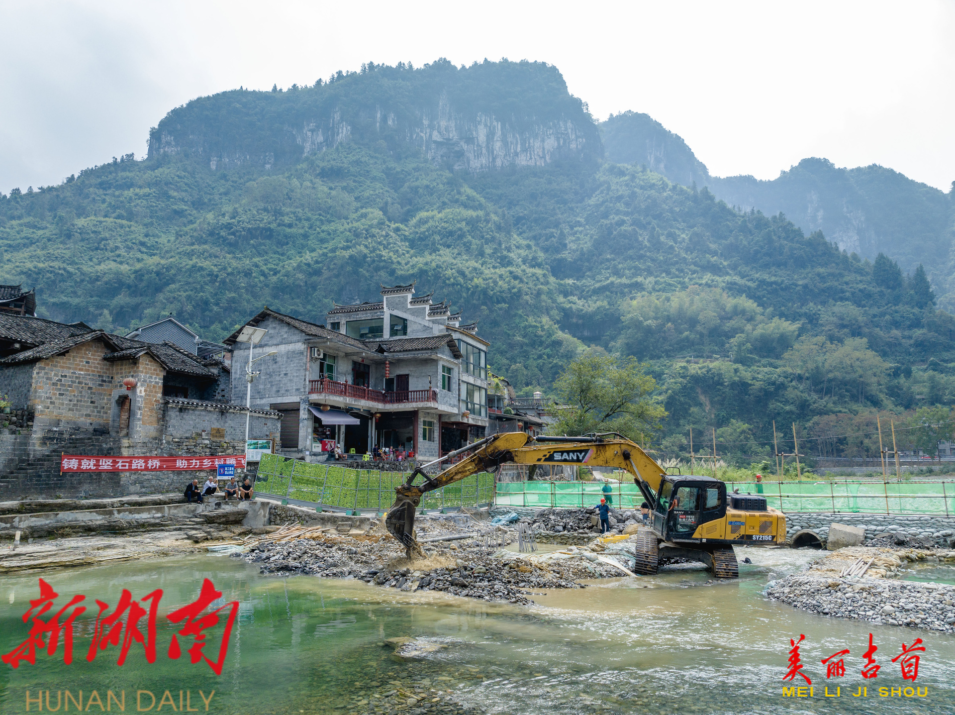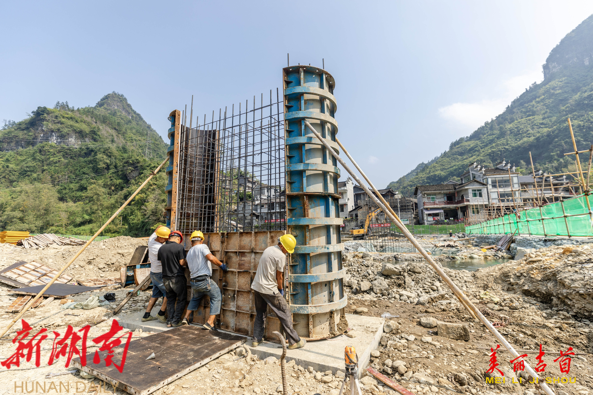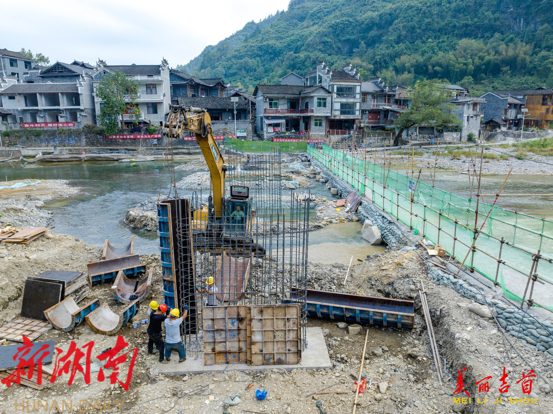 吉首市融媒体中心10月12日讯(全媒体记者 彭璟) 2025年10月12日,吉首市矮寨镇坪朗村,工人在便民桥建设现场施工。坪朗村作为全国传统村落及省级特色旅游名村、州级乡村旅游示范点,该桥建成后将切实解决村民出行难题,进一步助力乡村旅游发展。