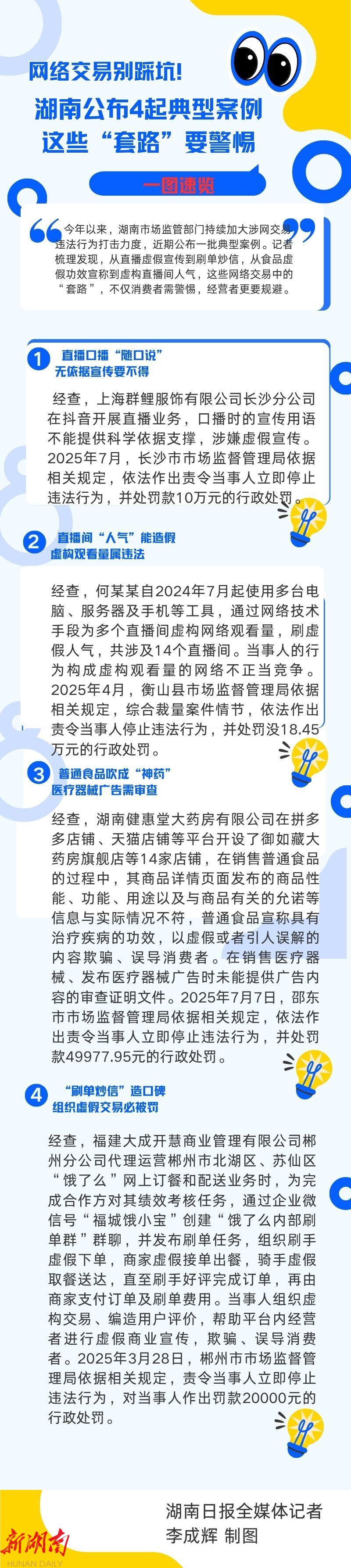 今年以来,湖南市 场监管部门持续加大涉网交易违法行为打击力度,近期公布一批典型案例。记者梳理发现,案例从直播虚假宣传到刷单炒信,从食品 虚假功效宣称到虚构直播间人气,这些网络交易中的“套路”,不仅消费者需警惕,经营者更要规避。
