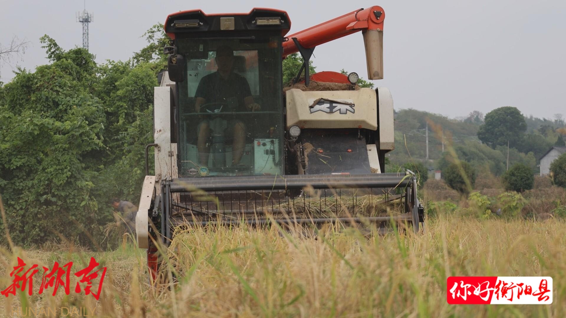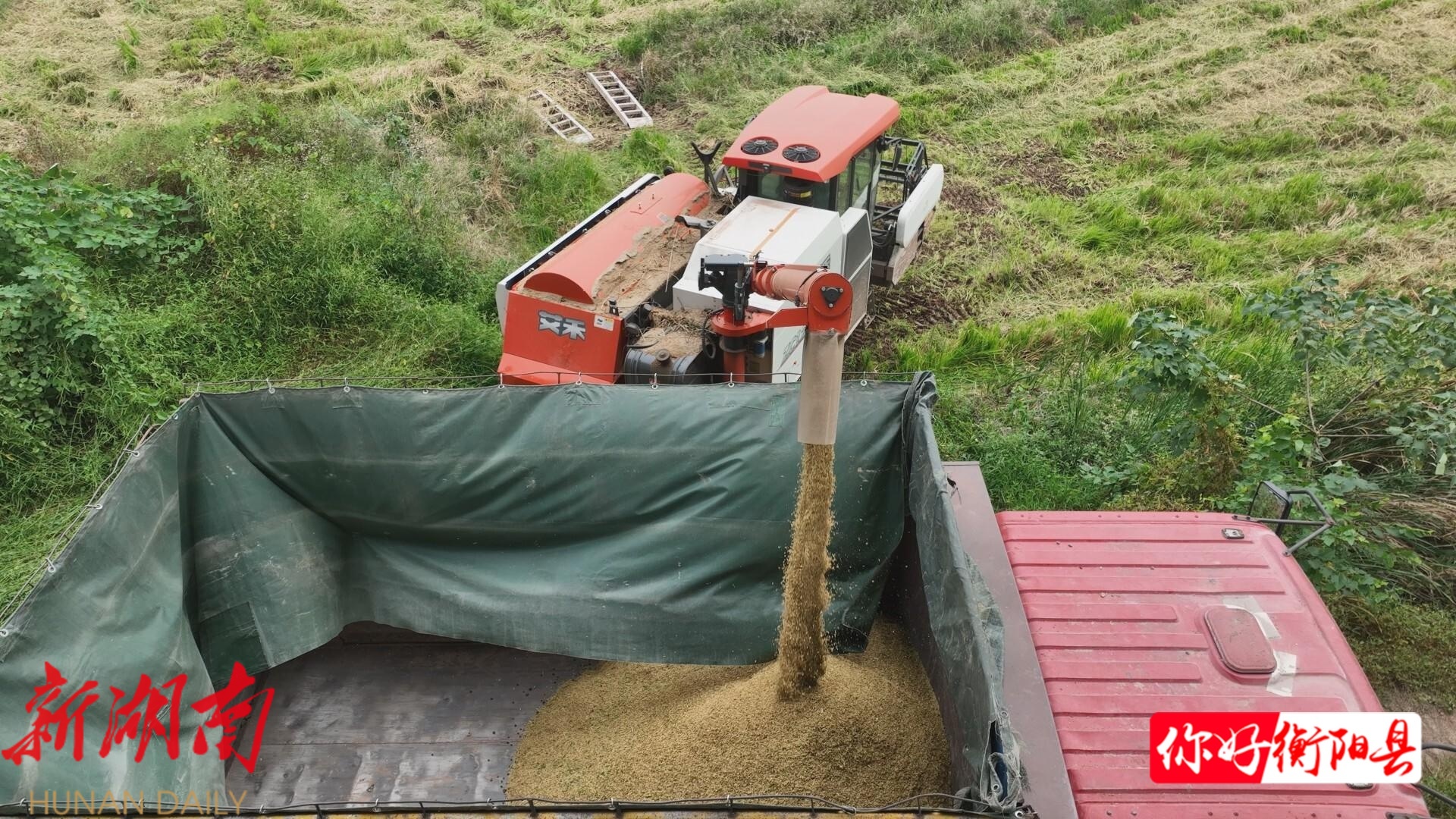 在栏垅乡均龙村的再生稻种植区,金灿灿的稻穗随风轻摇,阵阵稻香沁人心脾。种粮大户张俊益正组织两台收割机开展作业,农机在稻田里来回穿梭,割稻、脱粒、稻谷装车一气呵成,处处是繁忙的丰收景象。