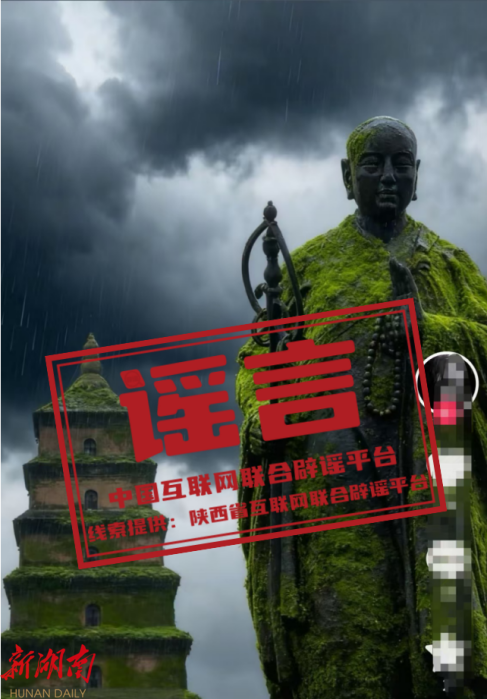 真相: 近日,有网民在网络平台发布一张西安大雁塔南广场玄奘法师雕塑布满绿色青苔的图片,引发关注。经向西安大慈恩寺求证,位于大雁塔南广场的玄奘法师铜像并未出现青苔生长情况,网传图片系AI生成。(来源:@陕西省网络举报中心)